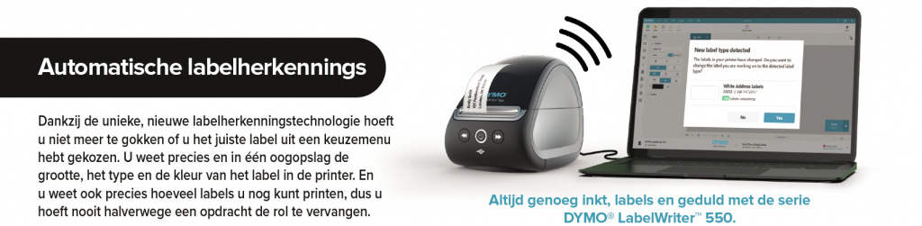 De nieuwe en verbeterde LabelWriter™ 550 Turbo-printer is een snelle, effectieve oplossing voor professionele labels voor post, archivering, bezoekersbeheer en andere labels, met LAN-verbinding zodat u binnen het volledige netwerk van computers kunt printen (maak verbinding met uw netwerk via een ethernetkabel en print vanaf elke computer in dat netwerk). Dankzij de unieke, nieuwe labelherkenningstechnologie hoeft u niet meer te gokken of u het juiste label uit een keuzemenu hebt gekozen. U weet precies en in één oogopslag de grootte, het type en de kleur van het label in de printer. En u weet ook precies hoeveel labels u nog kunt printen, dus u hoeft nooit halverwege een opdracht de rol te vervangen. De directe thermische printtechnologie zorgt ook dat u geen dure inkt of toner meer hoeft te kopen en het strakke, compacte en draagbare ontwerp zorgt dat de printer op elke moderne werkplek past. Bovendien is deze printer 45% sneller dan het basismodel, de LabelWriter™ 550, drukt de printer precies de juiste hoeveelheid labels af en is gedoe met etikettenvellen verleden tijd. Automatische, nieuwe labelherkenningsfunctie – zie de afmetingen, het type en het aantal resterende labels in één oogopslag. Snel – tot 45% sneller dan de LabelWriter™ 550, print tot 90 labels per minuut. De LAN-verbinding zorgt dat u verbinding met één machine kunt maken en de printer overal kunt gebruiken. Gebruik alleen hoogwaardige, BPA-vrije DYMO® Authentic LabelWriter™-labels, papieren labels van FSC®-materiaal