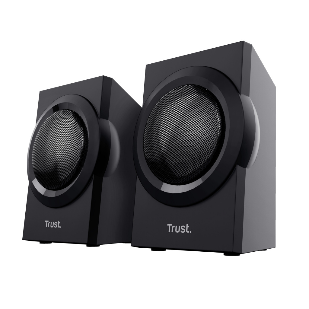 De Trust Yuri 2.1-Luidsprekerset Met Subwoofer is een echte blikvanger. Het gladde en compacte design heeft een stijlvolle zwarte finish en een houten subwoofer. Het compacte formaat maakt ‘m bruikbaar binnen elke setup, of dat nu in je woonkamer of thuiskantoor is.