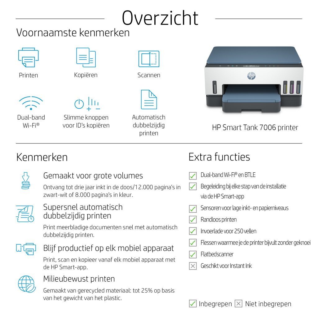 HP Smart Tank 7006 Draadloos All-in-One Kleur Printer, Dubbelzijdig printen; Kopieerapparaat, Scanner