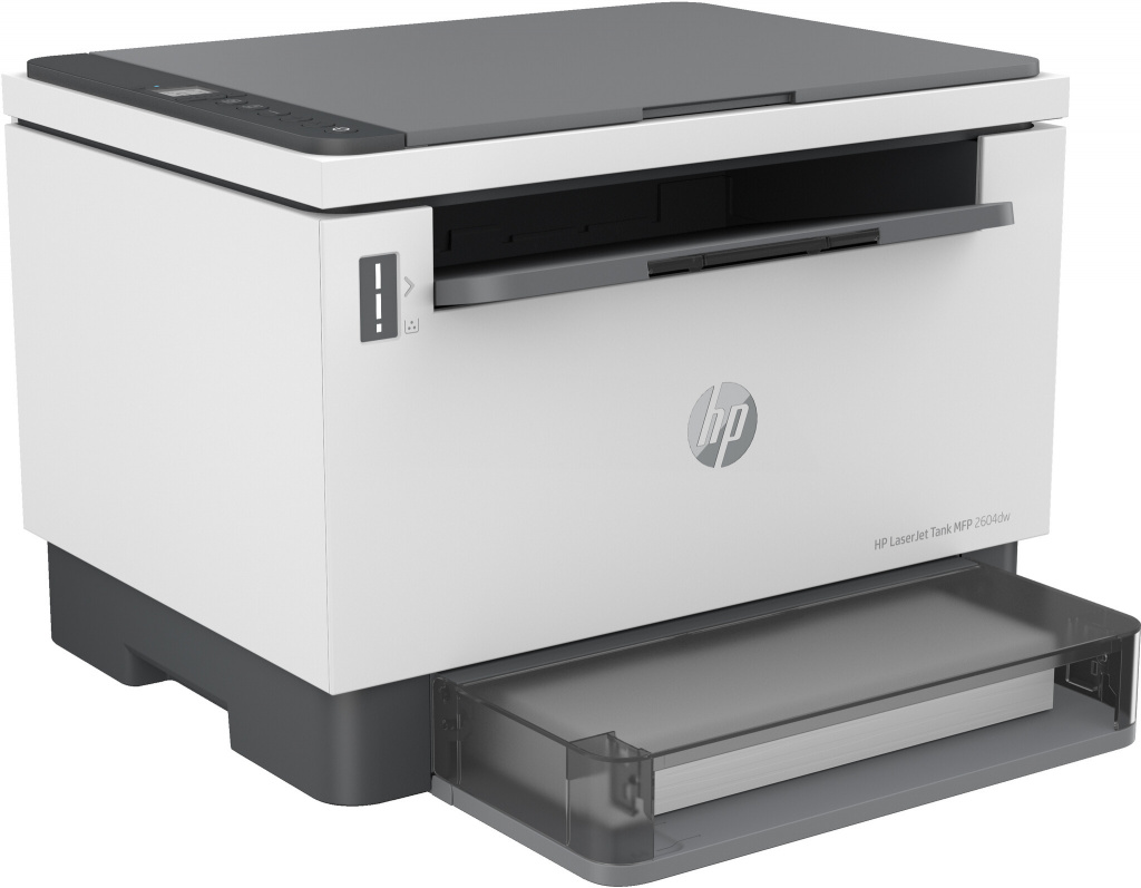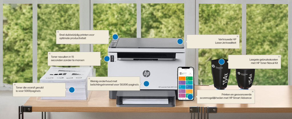 HP LaserJet Tank MFP 2604dw printer; HP Black Original LaserJet Tank belichtingstrommel (opbrengst meegeleverde zwarte toner ca. 5000 pagina's);Netsnoer; Installatiegids; Naslaggids; Flyers met regelg