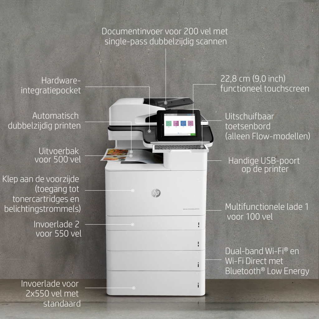 HP Color LaserJet Enterprise Flow MFP M776z printer; HP originele zwarte LaserJet tonercartridge (16.000 pagina's), HP cyaan, magenta en gele originele LaserJet tonercartridges (13.000 pagina's per ca