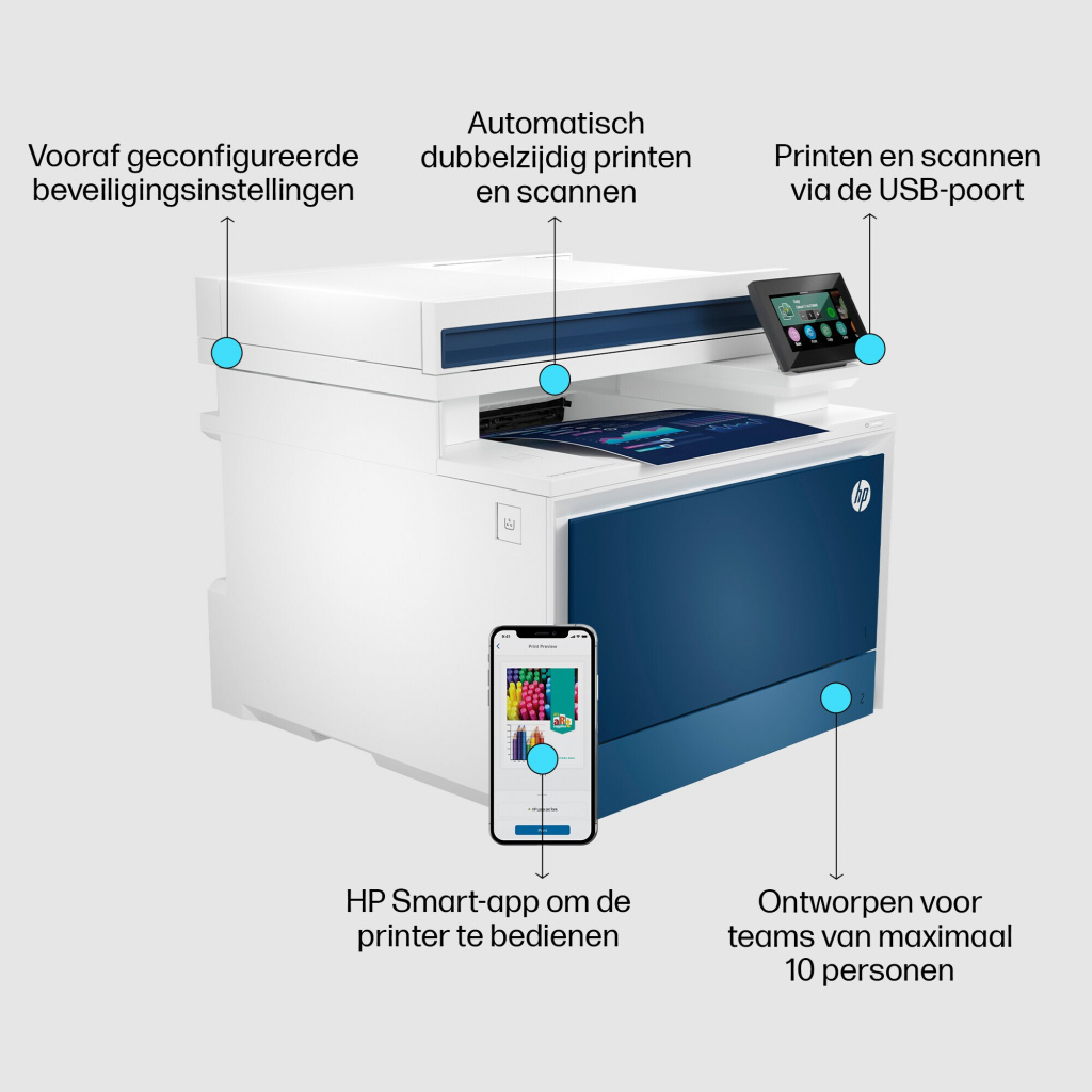 HP Color LaserJet Pro 4302fdw printer; 4 voorgeïnstalleerde HP LaserJet tonercartridges (zwart: 2000 pagina’s, introductiecartridge cyaan, magenta, geel: 1000 pagina's); Meegeleverde documentatie (