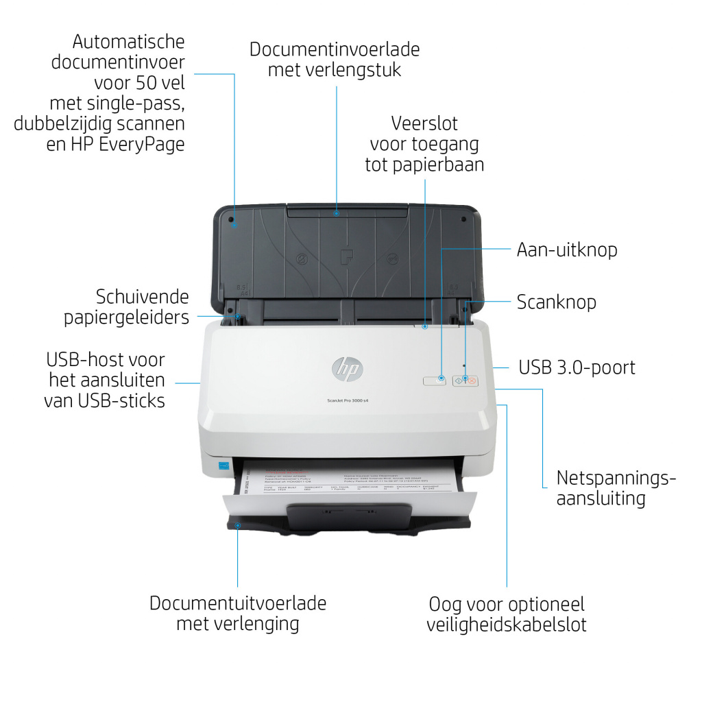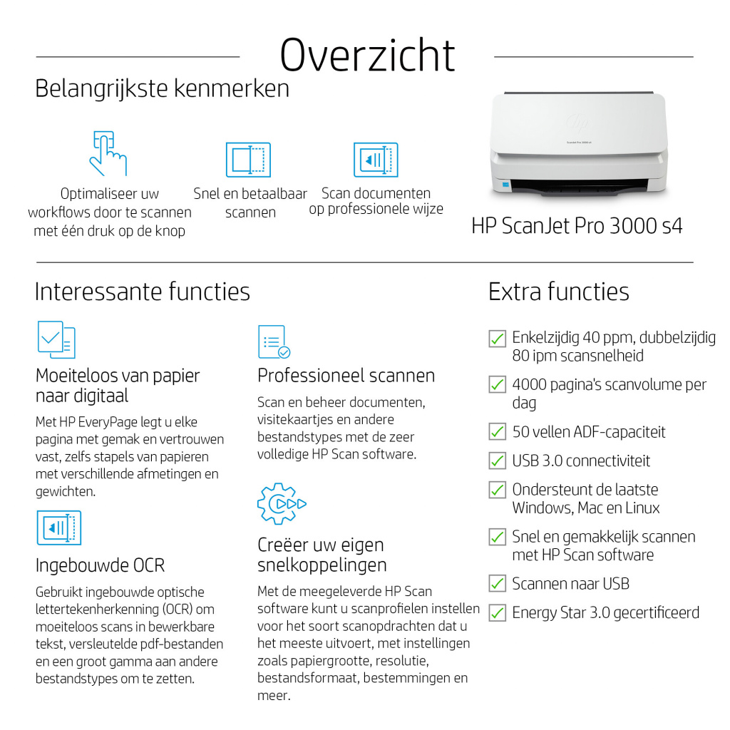 HP ScanJet Pro 3000 s4 scanner met automatische invoer; Netsnoer; Poweradapter; USB-kabel; Scan-engine; Flyers; Installatiegids
