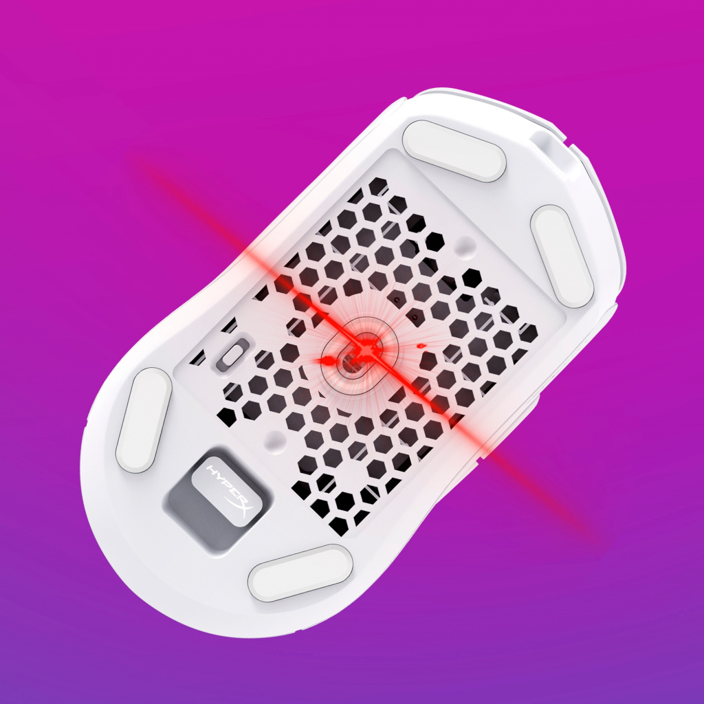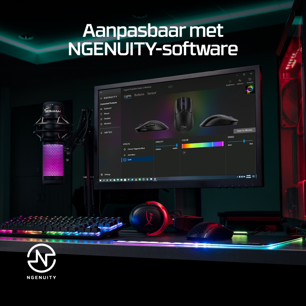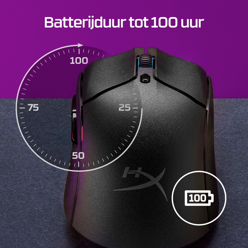 De HyperX Pulsefire Haste 2 Wireless is ontwikkeld voor gamers die het zich niet kunnen veroorloven ook maar een milliseconde te verspillen en de vrijheid willen om draadloos verbinding te maken. Deze opvolger heeft een harde behuizing en nog steeds het gewicht van 61 gram[3] en de batterijduur van 100 uur[2] van de oorspronkelijke Pulsefire Haste, maar bouwt daarop voort met verschillende verbeteringen. De Pulsefire Haste 2 Wireless biedt draadloze verbinding in 2 standen, waardoor je kunt wisselen tussen een draadloze verbinding van 2,4 GHz en Bluetooth. Ook heeft hij een oplaadkabel waarmee je de muis kunt opladen als je hem met de kabel gebruikt. We hebben ook een volledig pakket van krachtig presterende, aangepaste HyperX-componenten ontwikkeld, met als hoogtepunt de precieze HyperX 26K-sensor met een standaard DPI van maximaal 26.000 en een trackingsnelheid van maximaal 650 IPS. Onze aangepaste HyperX-switches laten je elke klik op een prettige manier voelen en horen en zijn beoordeeld voor een levensduur van tot 100 miljoen klikken. Daarnaast heb je uitstekende fysieke controle over de muis met soepele skates met weinig frictie en de meegeleverde anti-sliptape. Benut elke muisbeweging maximaal met HyperX NGENUITY-software en maak macro’s voor de zes programmeerbare knoppen, pas je DPI-instellingen aan en stel de RGB-verlichting in naar je eigen wensen.