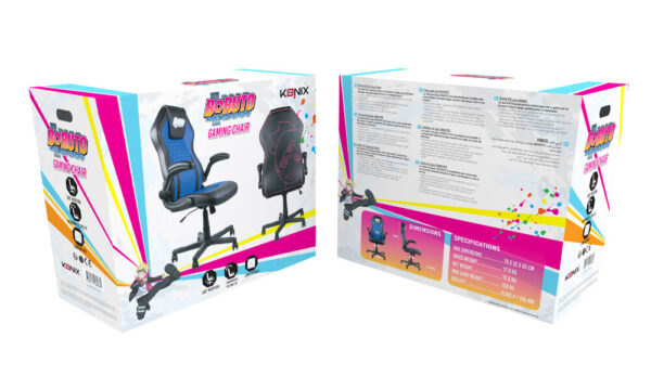 Konix Boruto 78441118339. Type product: Gaming leunstoel, Soort stoel: Gecapitonneerde zitting, Soort rugleuning: Gecapitonneerde rugleuning. Schommelhoek: 0 – 15°. Breedte: 690 mm, Diepte: 660 mm, Hoogte (min): 113 cm. Aantal per verpakking: 1 stuk(s), Breedte verpakking: 320 mm, Diepte verpakking: 700 mm