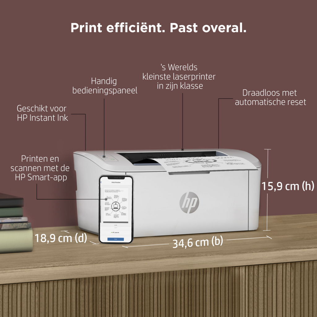 Print efficiënt. Past overal. Een efficiënte, hoogwaardige laserprinter die bij je ruimte en je budget past. Print snel met HP’s kleinste laserprinter in zijn klasse[1] en de tijdbesparende HP Smart-app.[2,3] Kies voor laserafdrukken van professionele kwaliteit en een eenvoudige installatie..