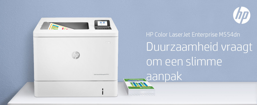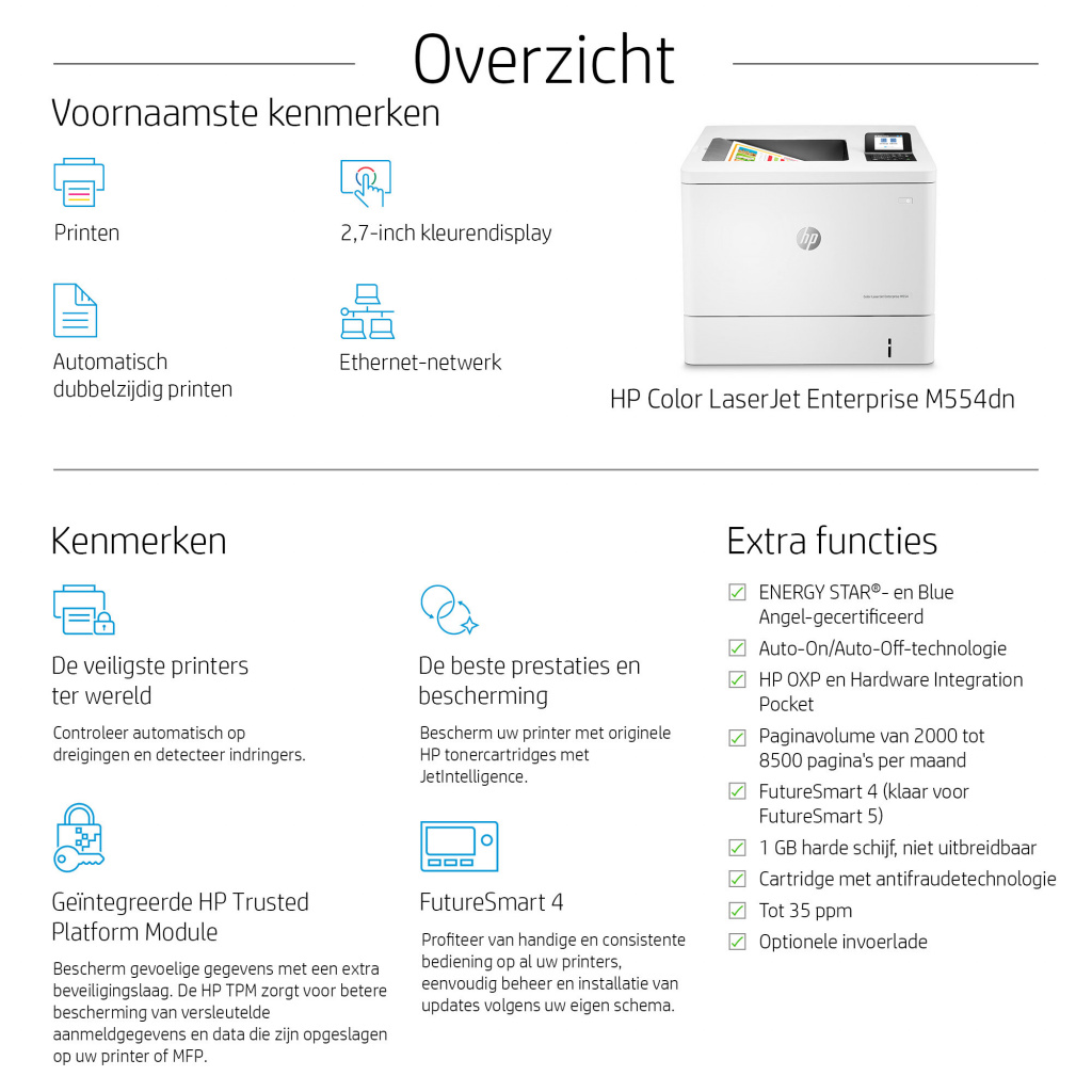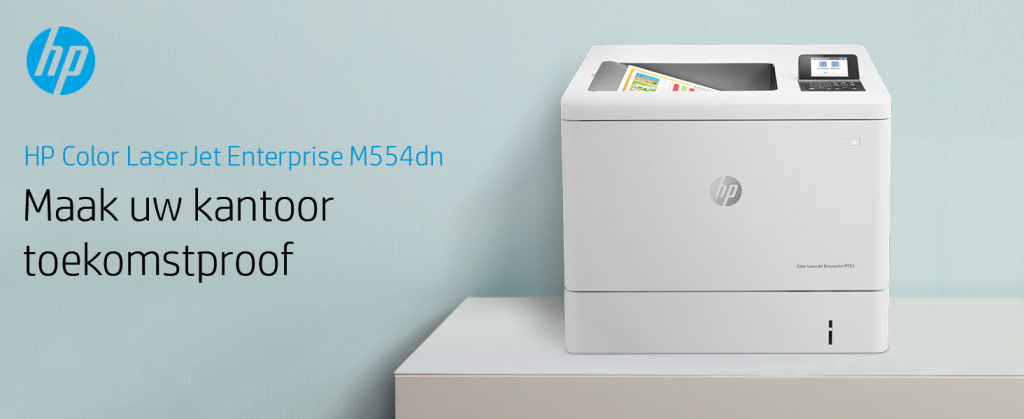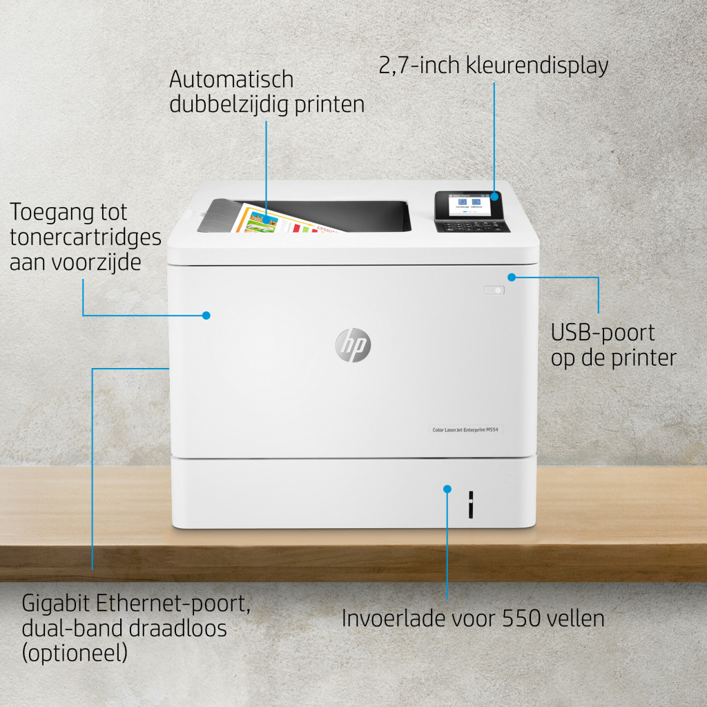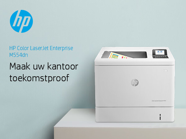 HP Color LaserJet Enterprise M554dn printer; Vier voorgeïnstalleerde HP LaserJet tonercartridges (opbrengst 5500 pagina's in zwart, 3500 pagina's gezamenlijke opbrengst in cyaan, magenta en geel); To