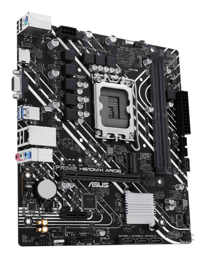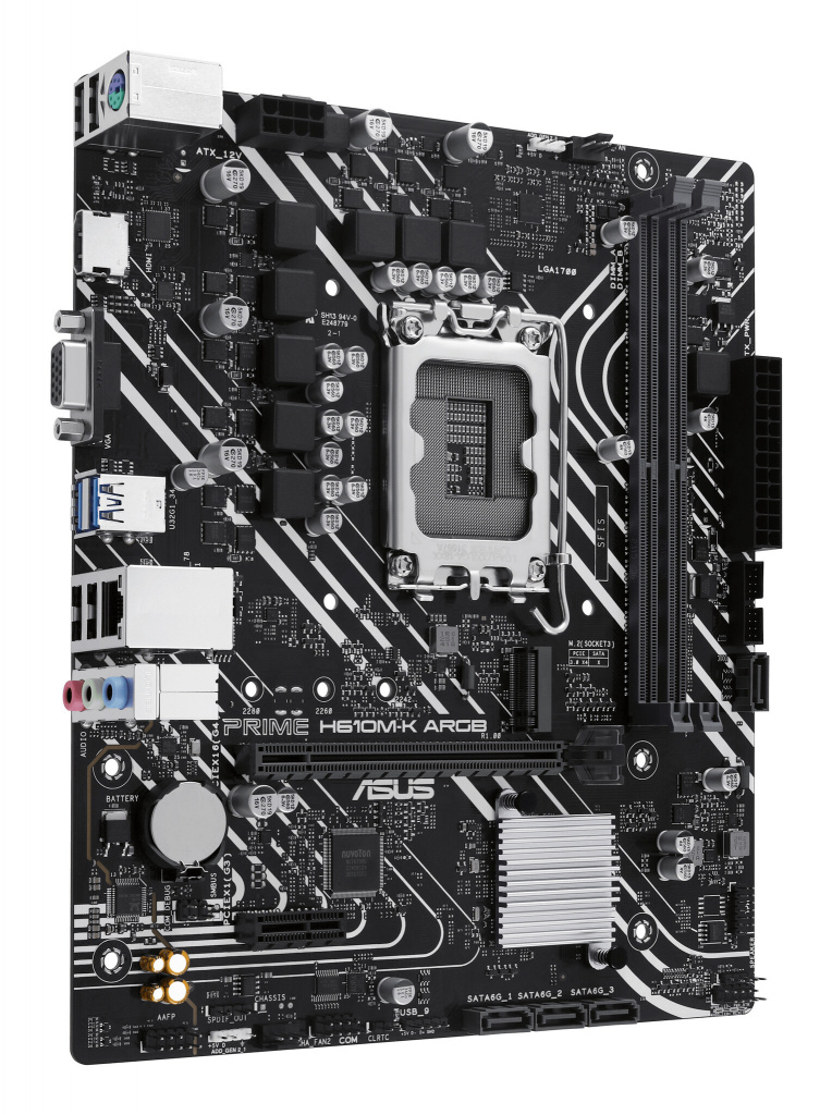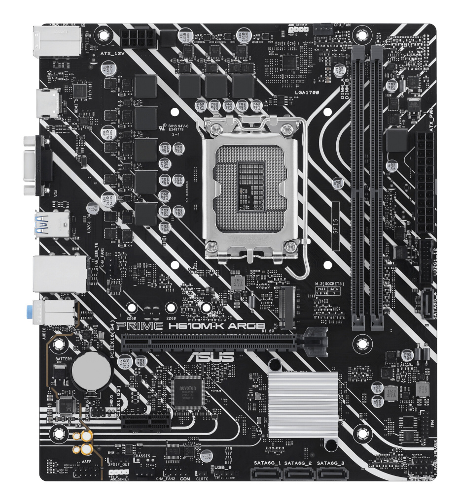 ASUS PRIME H610M-K ARGB. Processorfabrikant: Intel, Processor socket: LGA 1700, Compatibele processors: Intel® Celeron®, Intel® Core™ i3, Intel® Core™ i5, Intel® Core™ i7, Intel® Core™ i9,…. Ondersteunde geheugen types: DDR5-SDRAM, Maximum intern geheugen: 96 GB, Geheugen slots type: DIMM. Ondersteunde opslagstationinterfaces: M.2, SATA, Ondersteunde types opslag-drives: HDD & SSD. Ethernet interface type: Gigabit Ethernet. Component voor: PC, Moederbord form factor: micro ATX, Moederbord chipset familie: Intel