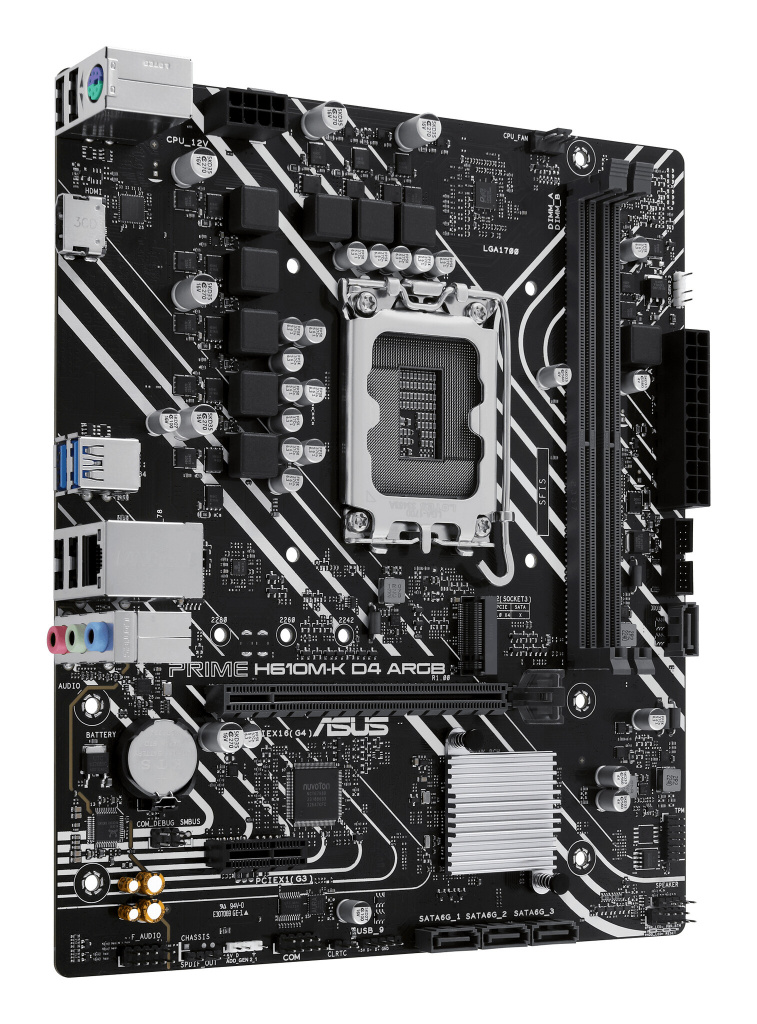 ASUS PRIME H610M-K D4 ARGB. Processorfabrikant: Intel, Processor socket: LGA 1700, Compatibele processors: Intel® Celeron®, Intel® Pentium® Gold, Intel® Core™ i3, Intel® Core™ i5, Intel® Core™…. Ondersteunde geheugen types: DDR4-SDRAM, Maximum intern geheugen: 64 GB, Geheugen slots type: DIMM. Ondersteunde opslagstationinterfaces: M.2, SATA III, Ondersteunde types opslag-drives: HDD & SSD. Ethernet interface type: Gigabit Ethernet. Component voor: PC, Moederbord form factor: micro ATX, Moederbord chipset familie: Intel