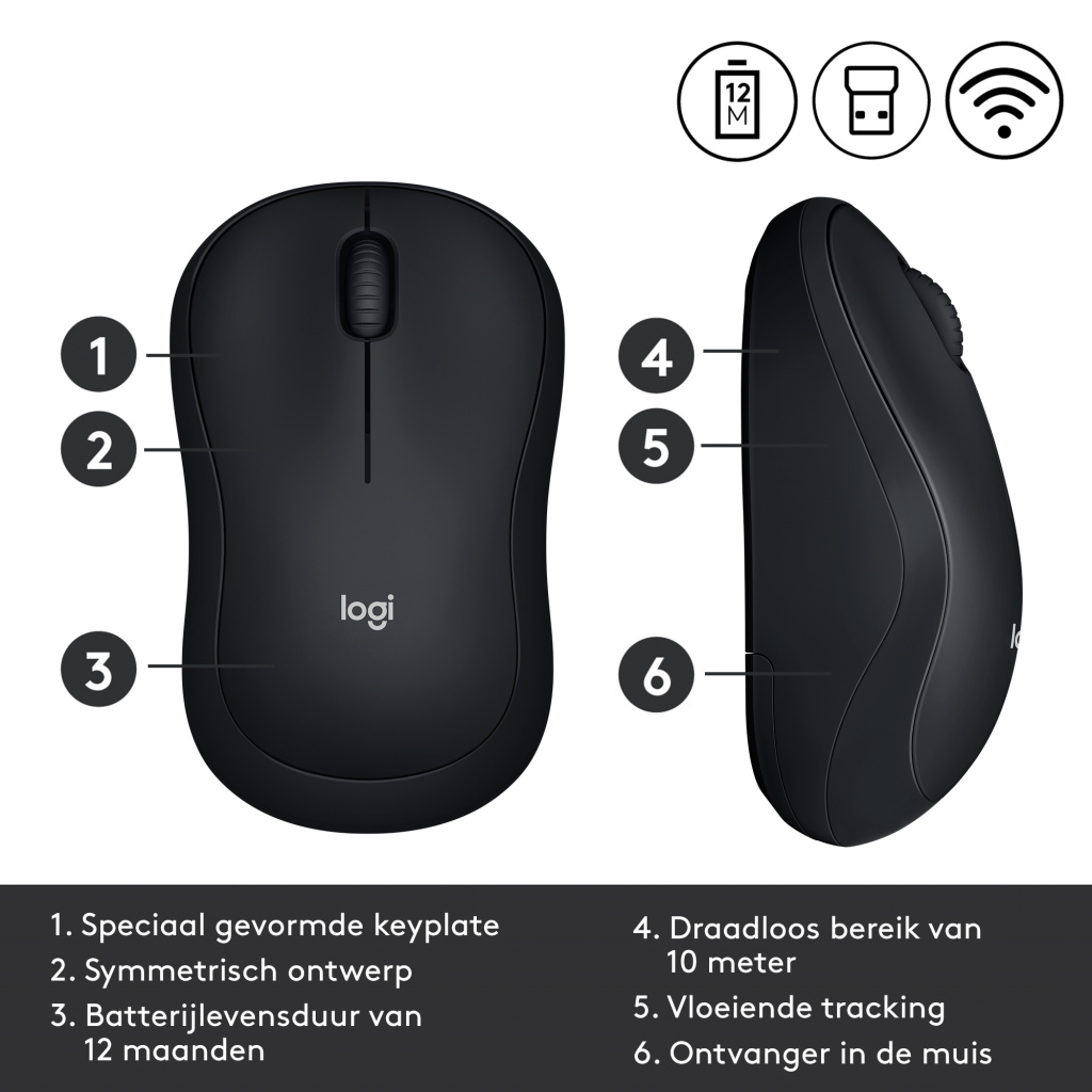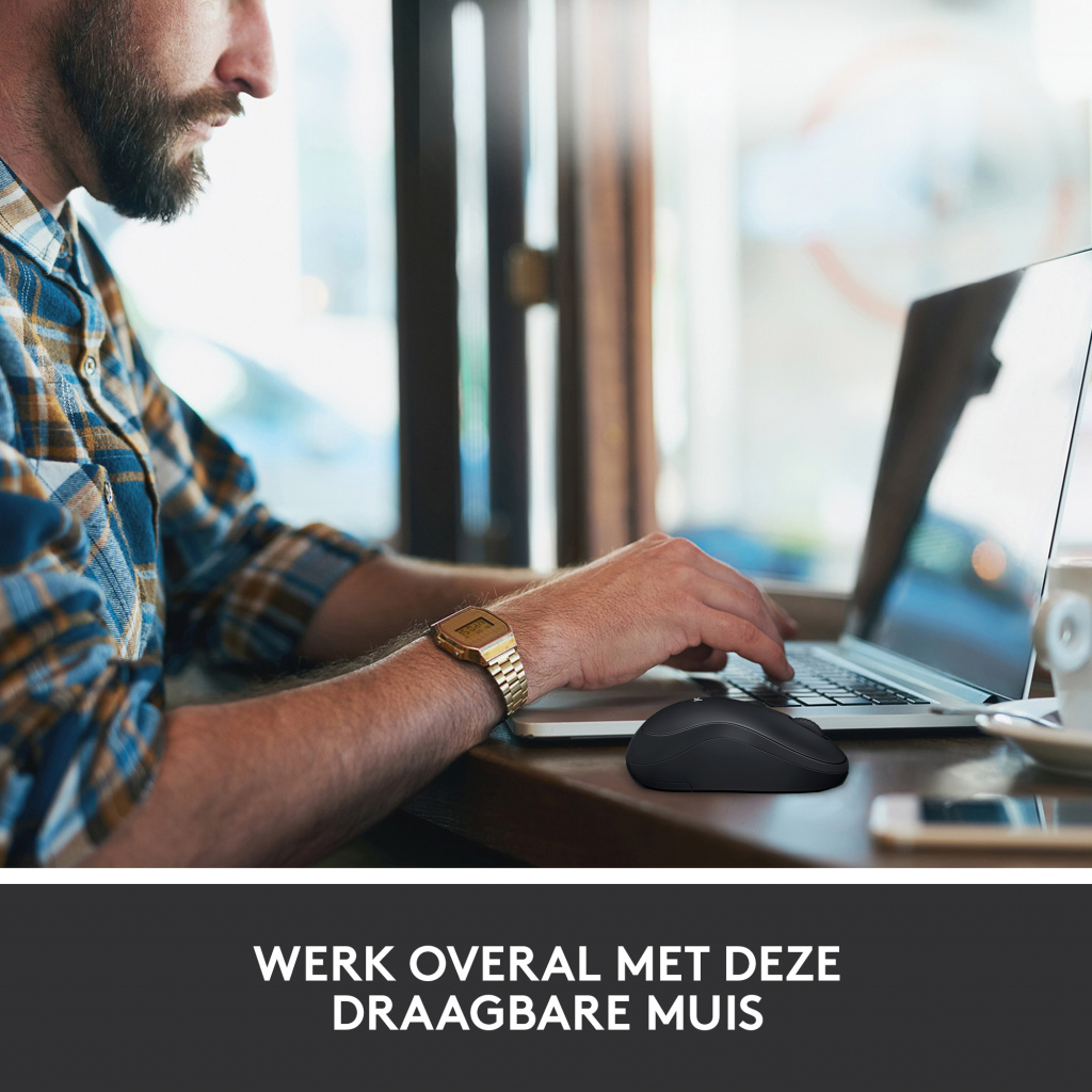 Blijf langer productief met de comfortabele, geronde vorm die de natuurlijke vorm van uw hand volgt. De muis is compact en draadloos en past eenvoudig met uw laptop in een tas, zodat u deze overal mee naartoe kunt nemen. De M185 is ontworpen om zowel voor rechts- als linkshandigen even comfortabel te zijn.