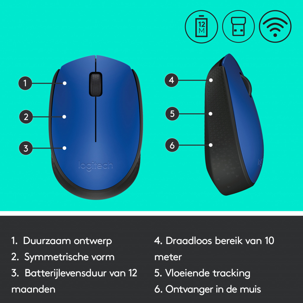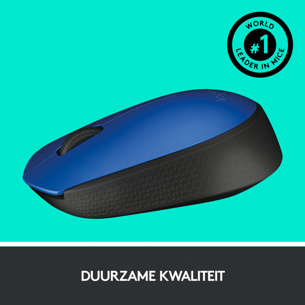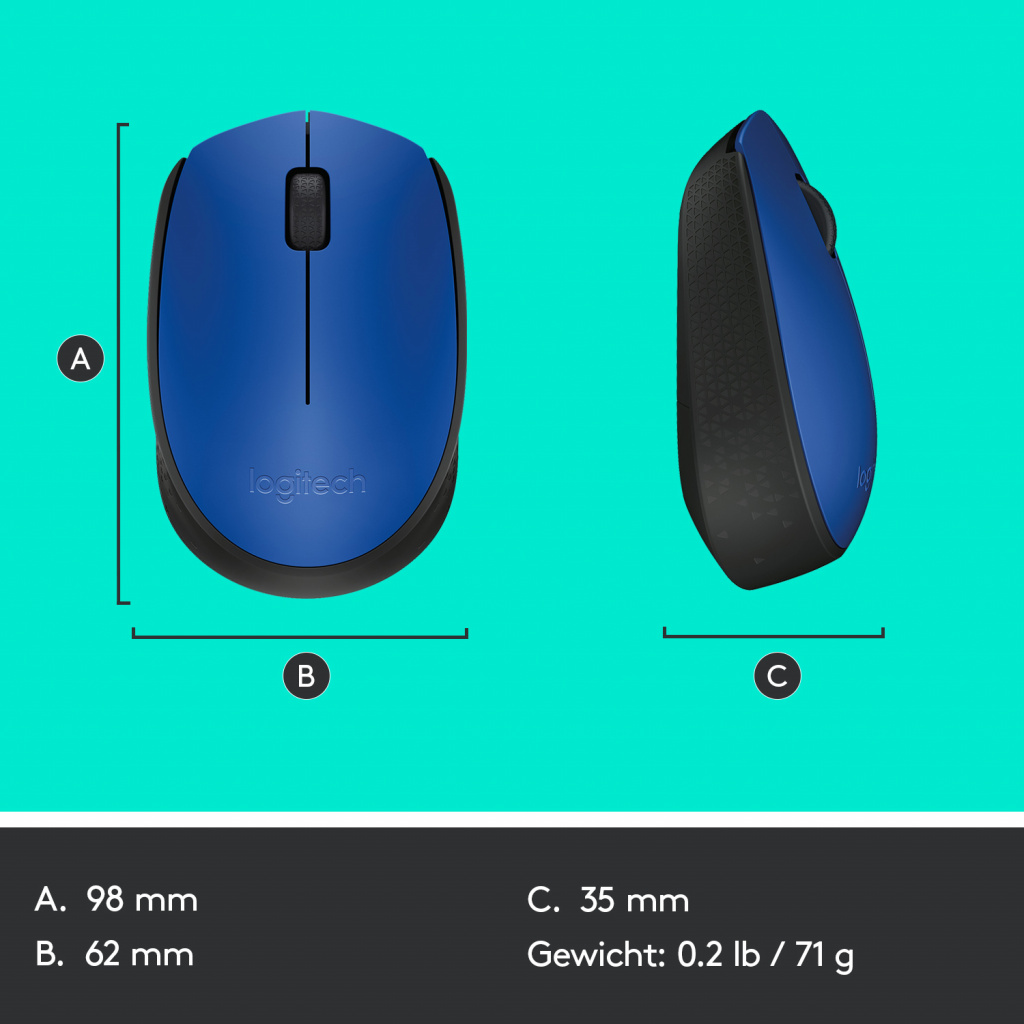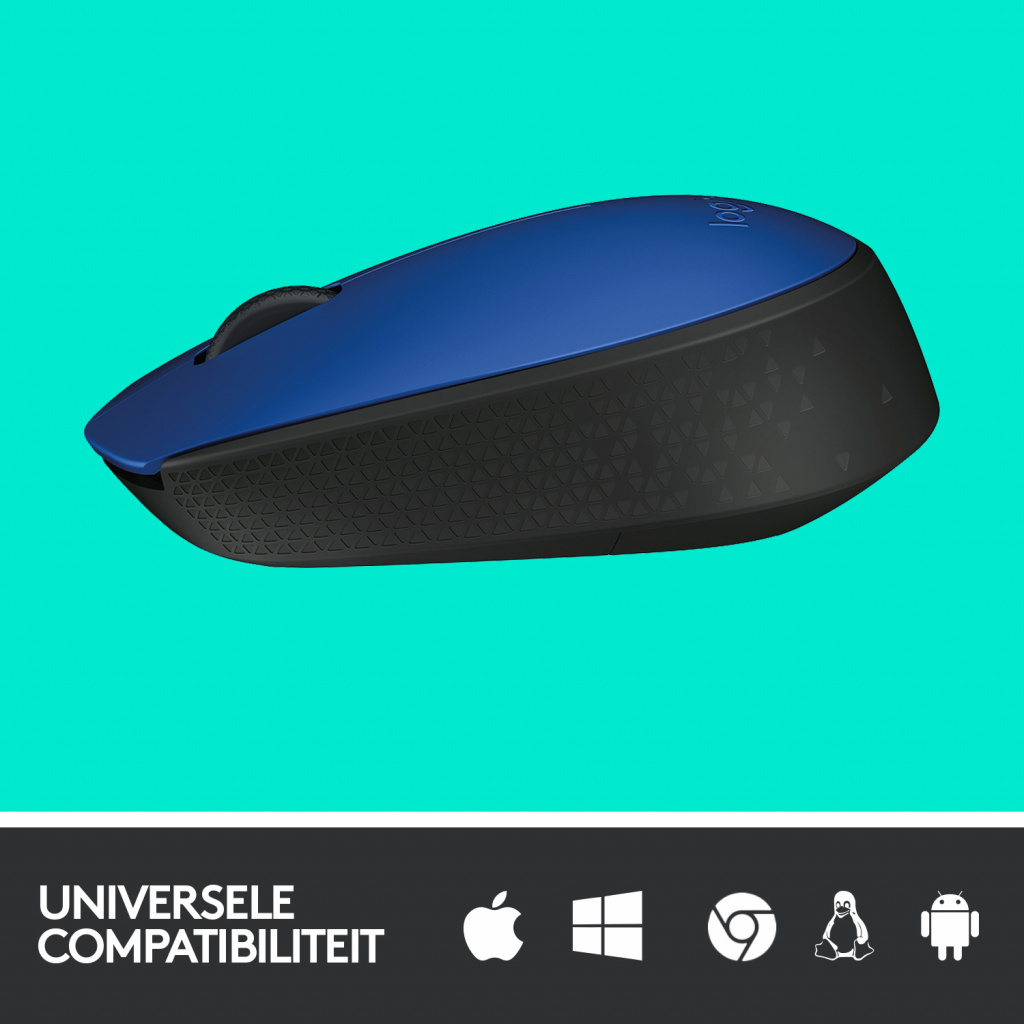 Logitech M171 Blue-K. Vormfactor: Ambidextrous. Bewegingsdetectietechnologie: Optisch, Aansluiting: RF Draadloos, Bewegingsresolutie: 1000 DPI, Soort knoppen: Drukknoppen, Aantal knoppen: 2, Scroll type: Wiel. Stroombron: Batterijen. Kleur van het product: Blauw