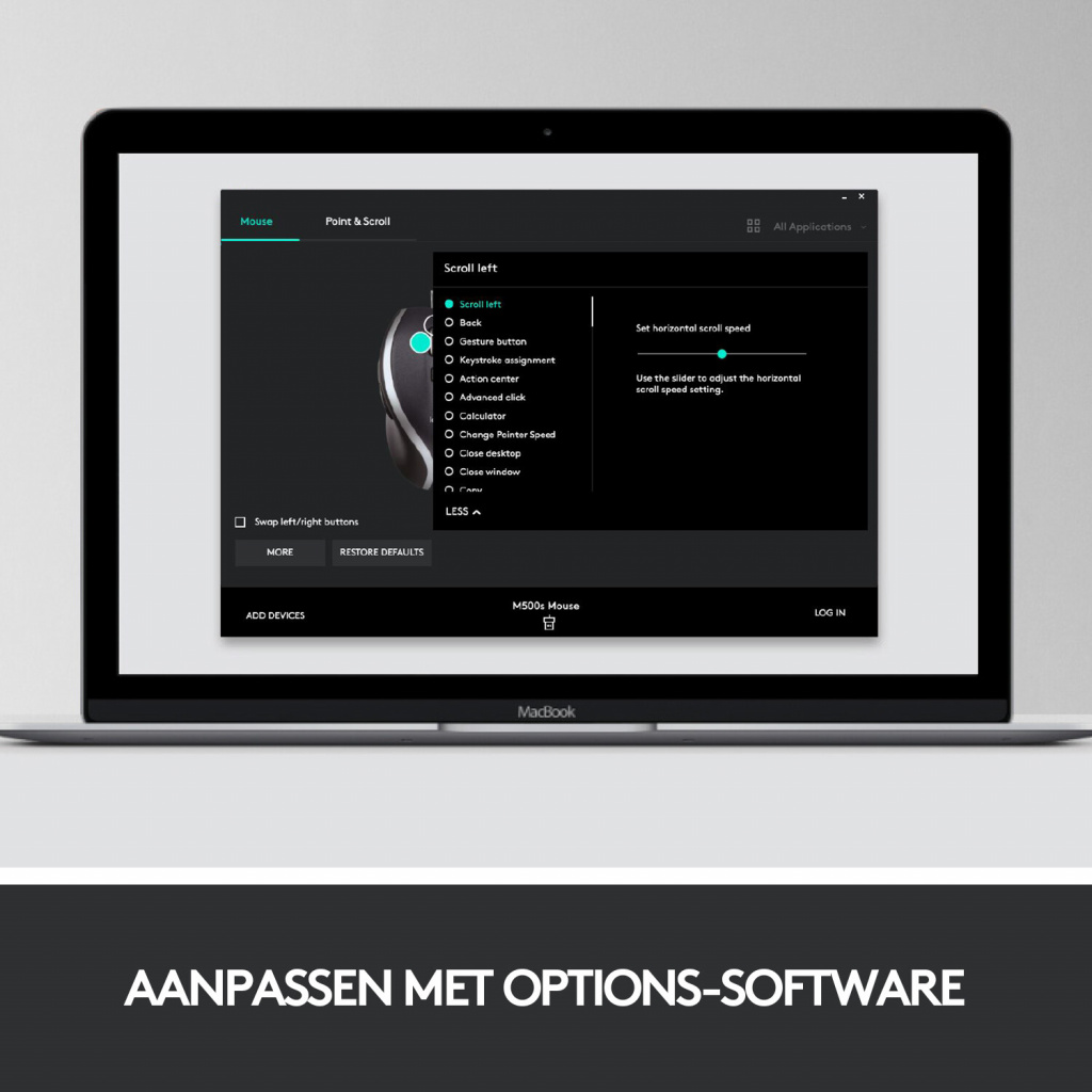 De Logitech® Advanced Corded Mouse M500s met supersnel scrollen voor hogere productiviteit. Met slechts één draai aan het soepele scrolwiel kun je door lange documenten en webpagina’s vliegen. Of schakel over op de kliksgewijze modus voor nauwkeurige regelnavigatie van lijsten, dia’s, afbeeldingen en menu’s. Nu met aanpasbare dpi van 400-4000 voor snelle en uiterst nauwkeurige cursorbesturing. Zachte zijkanten en een gerond ontwerp zorgen voor meer steun en controle. Dankzij de zeven aanpasbare knoppen kun je gemakkelijk door webpagina’s en fotoalbums navigeren. Plug-and-play-USB werkt direct uit de doos.