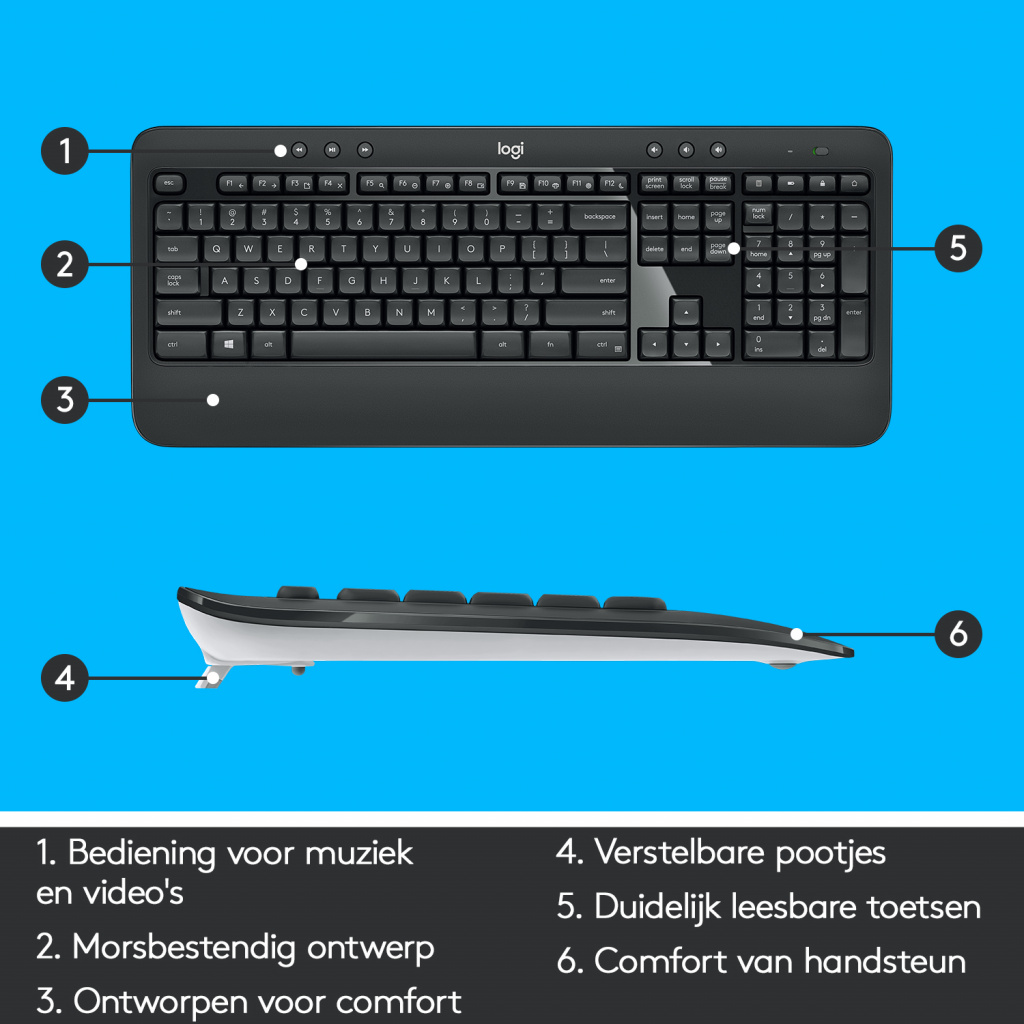 Uw toetsenbord heeft 36 maanden lang geen nieuwe batterijen nodig en de muis gaat 18 maanden mee. Het toetsenbord is morsbestendig (tot 60 ml vloeistof) en de slijtvaste belettering van de toetsen zorgt dat deze niet snel zullen vervagen.