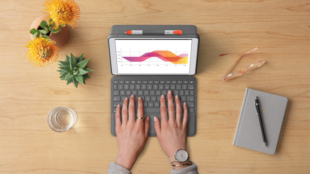 Ontworpen voor gebruik met Logitech Crayon als Apple Pencil (1e generatie), zodat je met de hand aantekeningen en tekeningen kunt maken, of documenten rechtstreeks op iPad kunt markeren. Bovendien is er een ingebouwde houder voor je stylus, zodat je deze altijd bij de hand hebt.