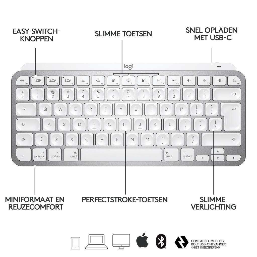 MX Keys Mini voor Mac is geoptimaliseerd voor macOS, iPadOS en iOS en heeft een toetsenbord met een lay-out voor Mac, voor maximale productiviteit