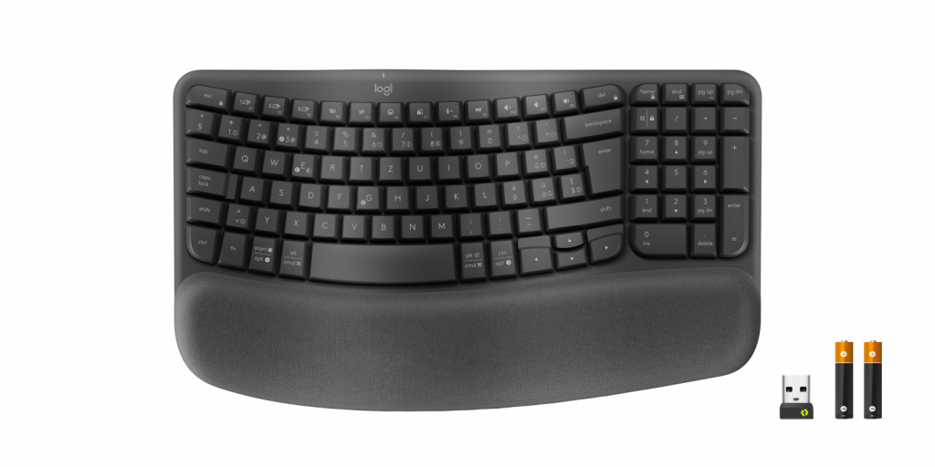 Logitech Wave Keys for Business. Toetsenbord formaat: Volledige grootte (100%). Stijl toetsenbord: Gebogen. Connectiviteitstechnologie: Draadloos, Aansluiting: RF-draadloos + Bluetooth, Toetsenbord toetsschakelaar: Membraan keyswitch, Toetsenbordindeling: QWERTZ, Aantal toetsen, toetsenbord: 99. Polssteun. Aanbevolen gebruik: Kantoor. Kleur van het product: Grafiet