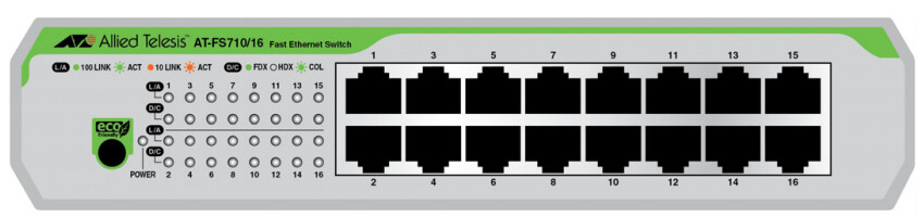 Allied Telesis AT-FS710/16-50. Switch type: Unmanaged. Type basis-switching RJ-45 Ethernet-poorten: Fast Ethernet (10/100), Aantal basis-switching RJ-45 Ethernet-poorten: 16. MAC-adrestabel: 8000 entries, Switchingcapaciteit: 3,2 Gbit/s. Netwerkstandaard: IEEE 802.3, IEEE 802.3az, IEEE 802.3u, IEEE 802.3x. Netstekker: DC-in ingang. Rack-montage, Vormfactor: 1U