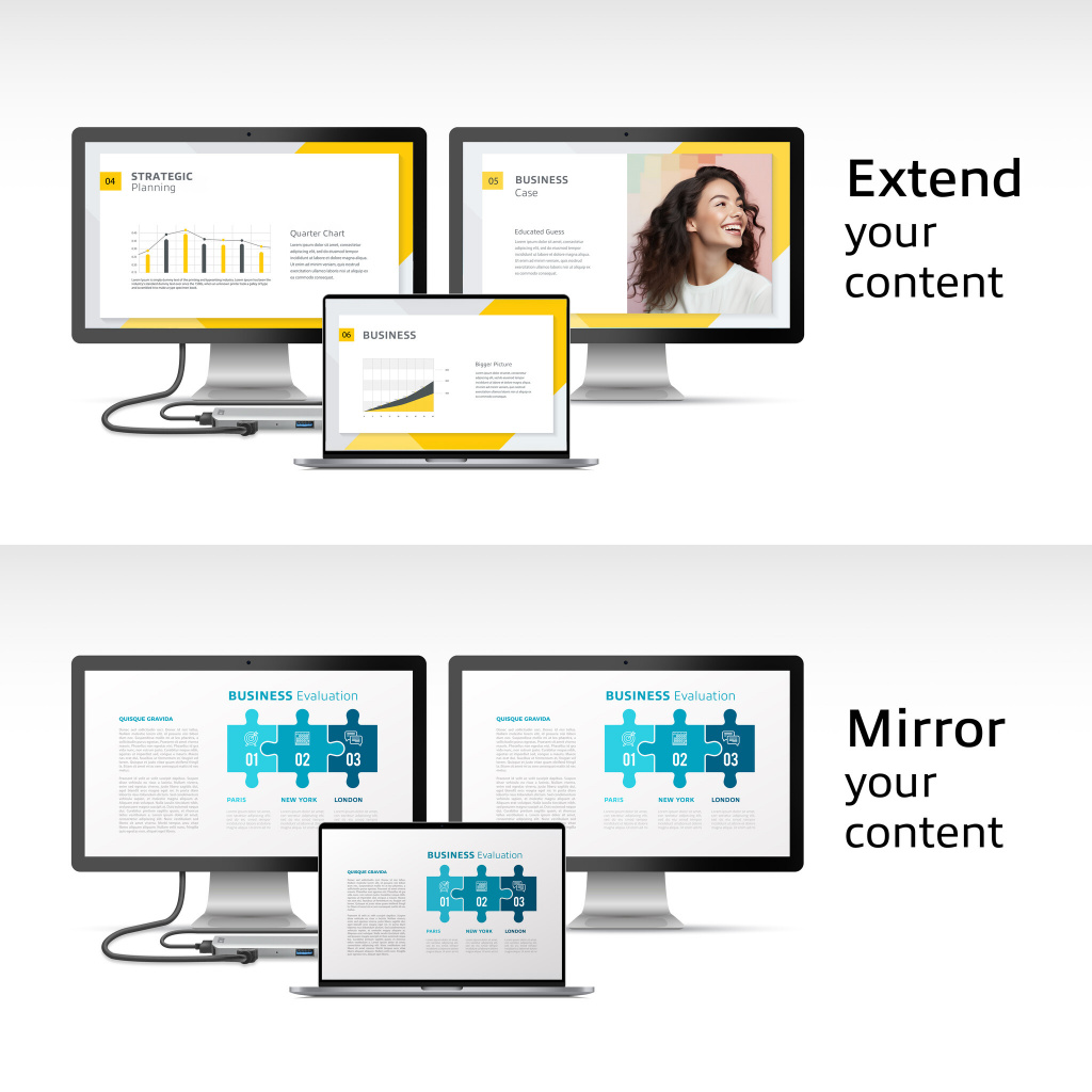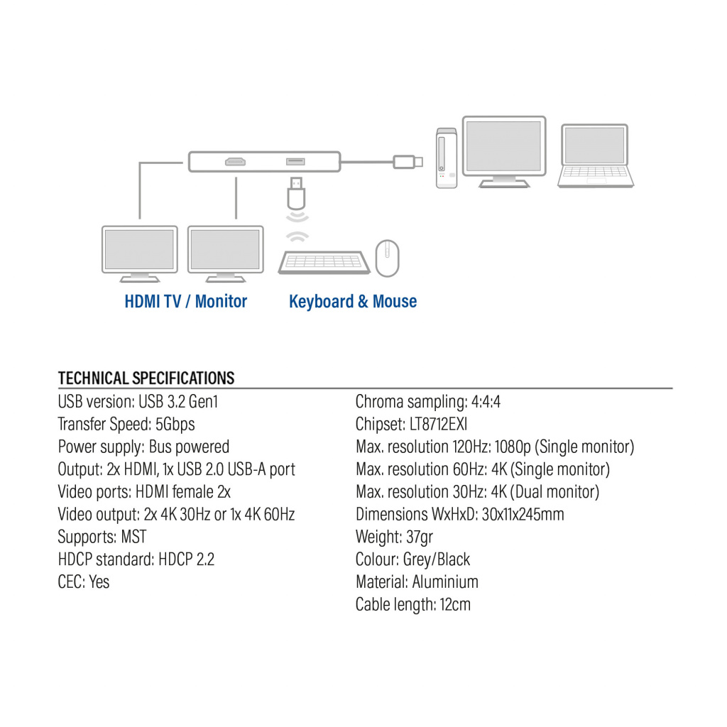 Breid je display uit naar twee extra HDMI monitoren met de AC7013 USB-C 4K multiport adapter met MST ondersteuning. Met deze adapter kloon je of breid je de desktop uit met 2 extra HDMI monitoren. De multiport adapter wordt via USB gevoed en voegt een USB-A datapoort toe aan je device.