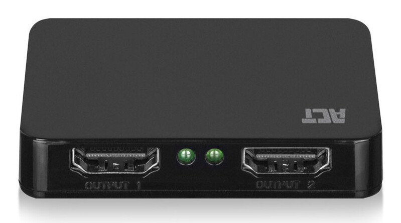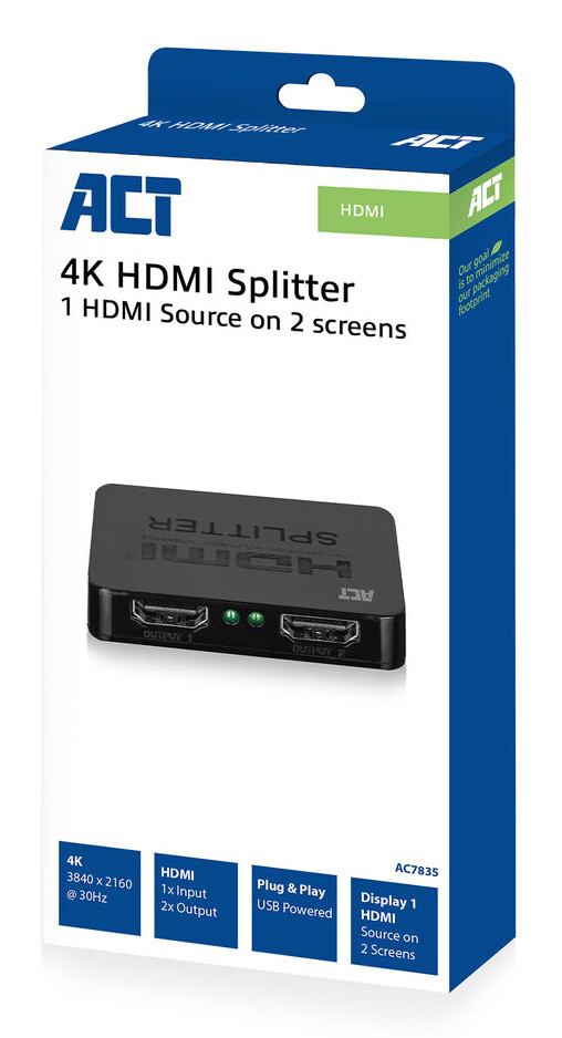 De ACT AC7835 4K HDMI Splitter splitst een enkel HDMI-signaal naar twee aparte tv’s/schermen. Sluit de AC7835 aan met een High Speed HDMI-kabel met een maximale 4K resolutie van 3840×2160 @ 30Hz en (3D) resolutie van 1080p @ 60Hz. De AC7835 wordt geleverd met een USB stroomkabel.