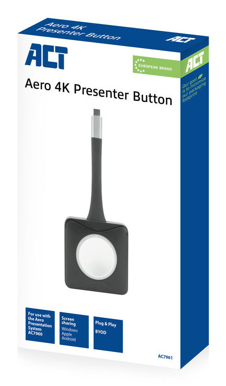 De AC7961 Aero 4K presentator knop is een extra button voor het gebruik met het AC7960 Aero 4K Draadloos Presentatiesysteem. Het systeem ondersteunt 16 presenter buttons waardoor je met meerdere gebruikers content kunt delen. De maximale afstand tussen het basisstation en de knop is 20 meter. De presentator knop wordt gevoed via USB Type-C® en koppel je gemakkelijk met het basisstation.