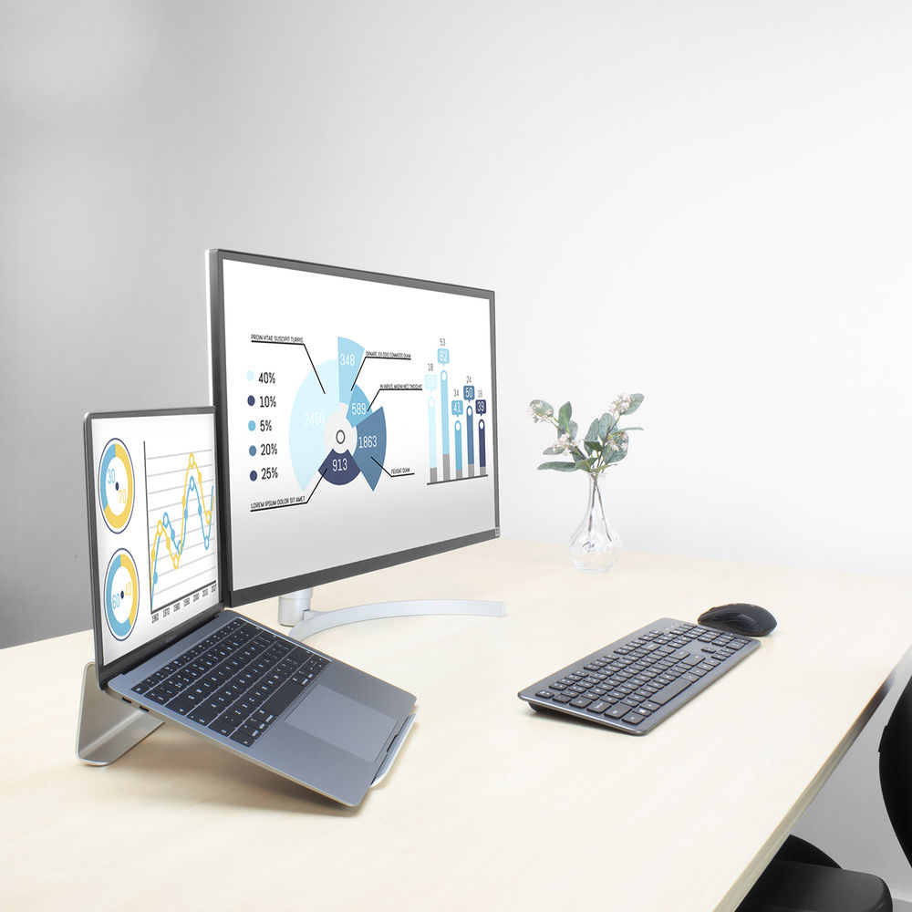 Gebruik de AC8115 Aluminium Laptopstandaard voor het ergonomisch werken op je laptop. De stevige aluminium stand heeft anti-slip rubberen pads die de laptop op de plaats houden. De stand is geschikt voor laptops tot 15,6”. De stand heeft een uitsparing voor de kabels.