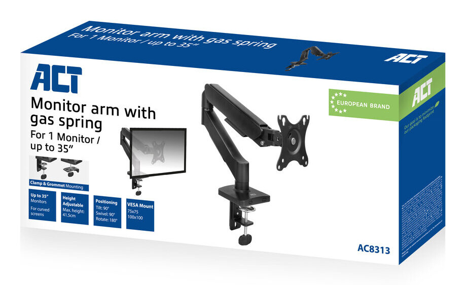 De volledig metalen AC8313 monitorarm is geschikt voor een enkele 35” (curved) monitor tot 9kg. Stel de beste hoogte en kijkafstand in met de gasveer en 3 draaipunten. Verder kun je de monitor kantelen, roteren of zwenken. Zowel een klem- als bureaudoorvoersysteem zijn meegeleverd.