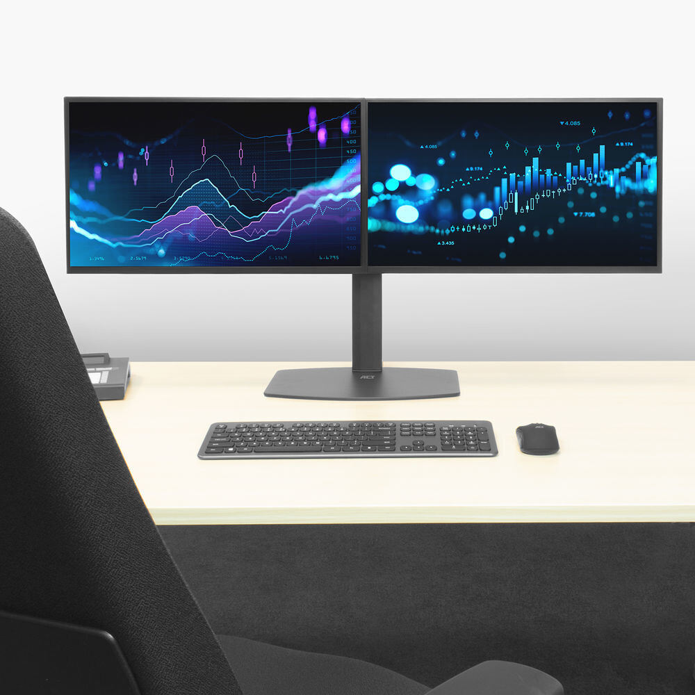 Creëer een ergonomische en ruimtebesparende werkplek door gebruik te maken van de AC8332 Monitor Bureausteun op voet. Plaats de monitorsteun op een bureau en bevestig twee schermen tot 27” en 6kg met behulp van het beeldschermmontagesysteem. De monitorsteun is ideaal voor flexwerkplekken omdat de kijkhoogte eenvoudig met een gasveer kan worden aangepast. De monitoren kun je aanpassen door deze te kantelen, te roteren of te zwenken. De kabels zijn netjes weg te werken met het handige kabelmanagementsysteem.