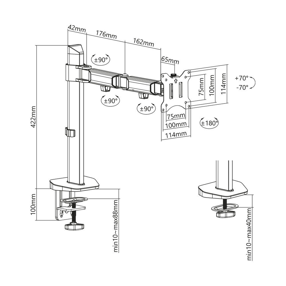 Dankzij het handige beeldschermmontagesysteem bevestig je eenvoudig zelf de monitor op de bureausteun. De steun heeft VESA 75×75 en 100×100. De AC8335 wordt compleet geleverd met alle montagemiddelen voor zowel klem- alsook doorvoermontage. De bureausteun is geschikt voor tafels met een maximale dikte van 88mm.