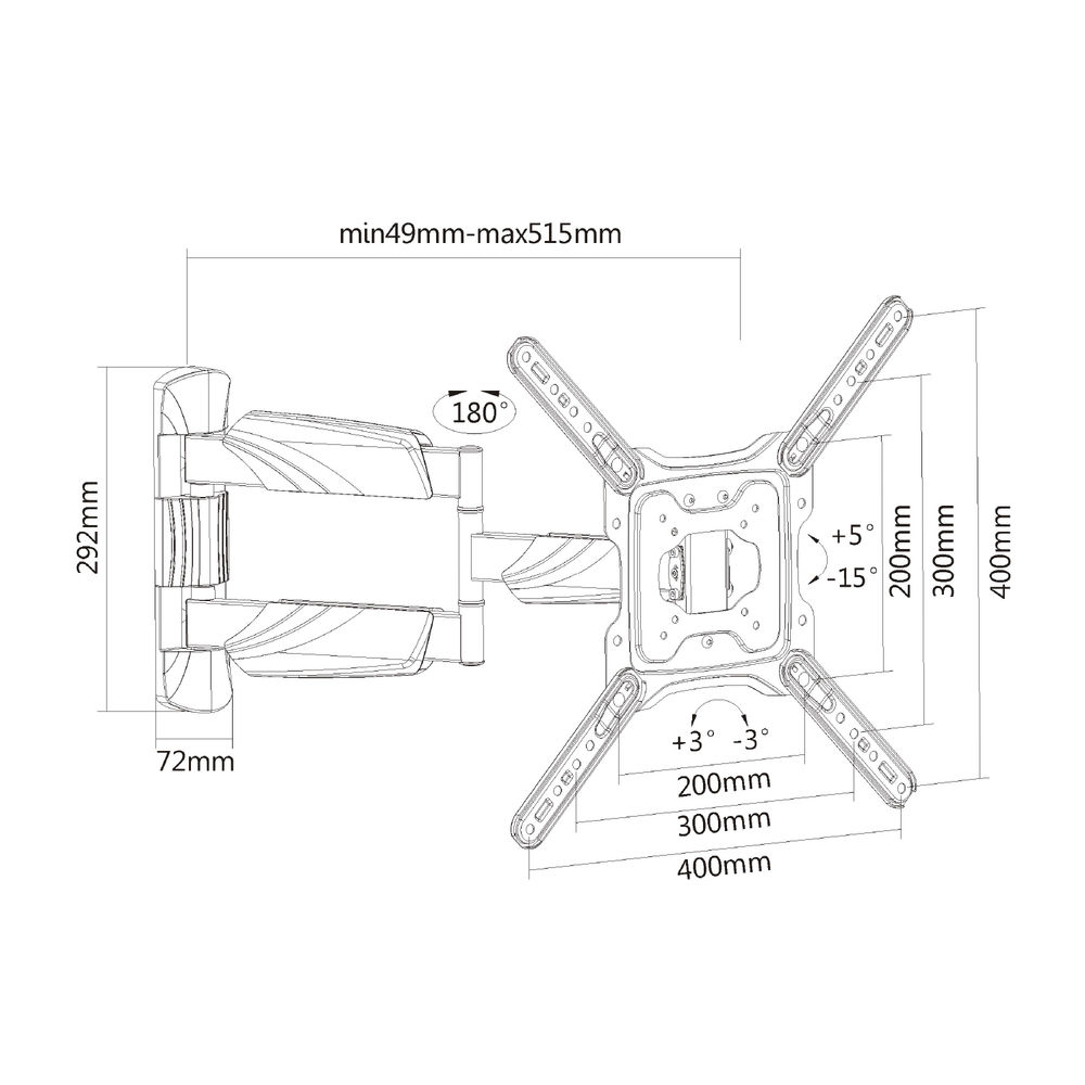De AC8354 Full Motion TV en Monitor Wandsteun is de ideale oplossing voor de wandmontage van een tv (23 inch tot en met 55 inch, maximaal gewicht 35 kg). De steun is zo ontworpen dat alle tv’s die zijn uitgerust met VESA 75×75, 100×100, 200×100, 200×200, 300×200, 300×300, 400×200, 400×300, 400×400 kunnen worden gemonteerd. De wandsteun kan naar boven en beneden kantelen met een hoek van +5°/-12° en van links naar rechts zwenken met een hoek van +15°/-15°. Daarnaast heeft de wandsteun 3 draaipunten met een maximale verlenging van 51 cm. Je draait de tv in elke gewenste positie voor de beste kijkhoek. Stel het scherm bij met een hoek van +3°/-3°. Kabels zijn netjes weg te werken dankzij het handige kabelmanagementsysteem.