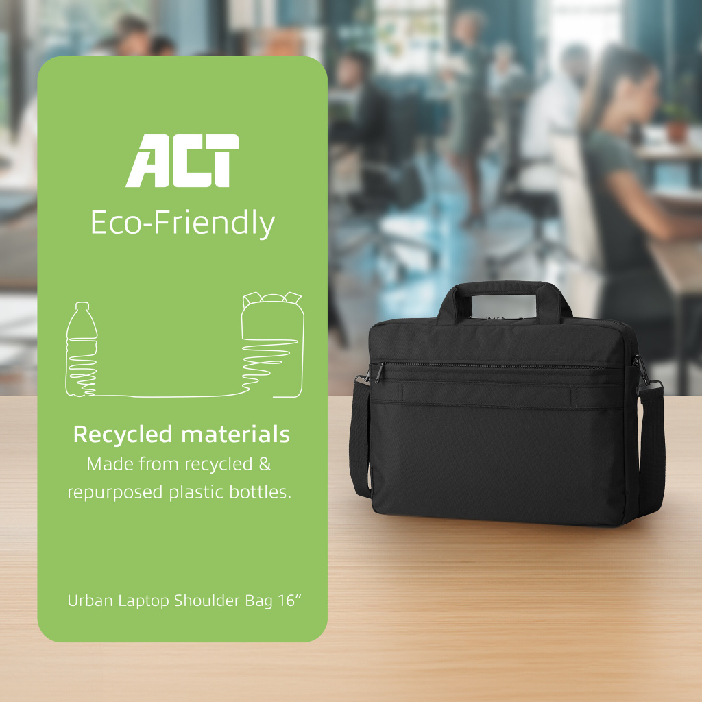 Neem je laptop overal mee naartoe met de ACT AC8525 16 inch Urban Laptop tas. Het stevige laptopcompartiment beschermt je notebook tegen stoten en krassen. De Urban Laptop tas heeft speciale vakken voor het opbergen van je tablet, documenten, stroomadapter, muis en andere spullen. Dankzij de handige handgrepen en afneembare draagriem is de tas gemakkelijk mee te nemen. De tas is gemaakt van waterafstotend rPET materiaal: gerecyclede plastic flessen.