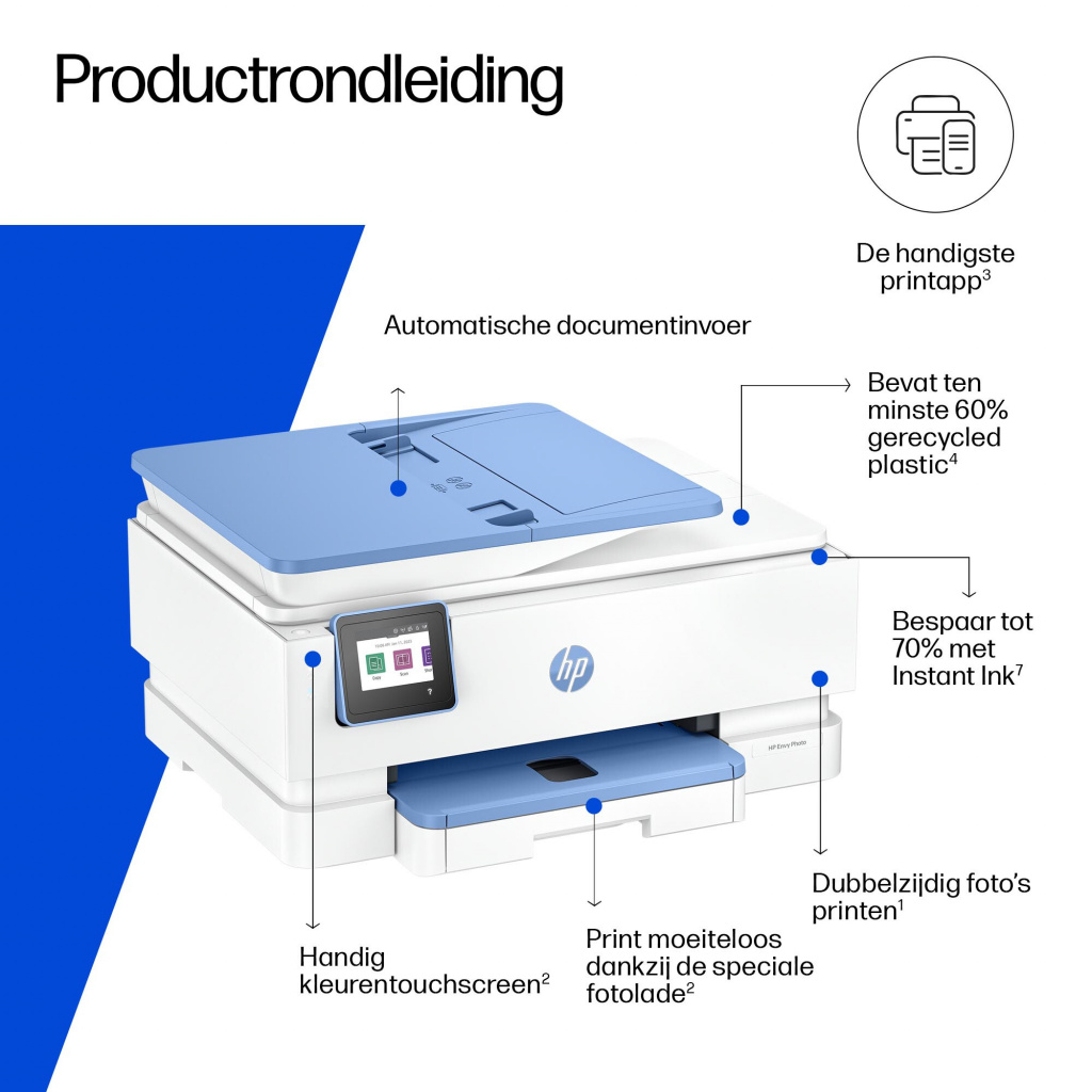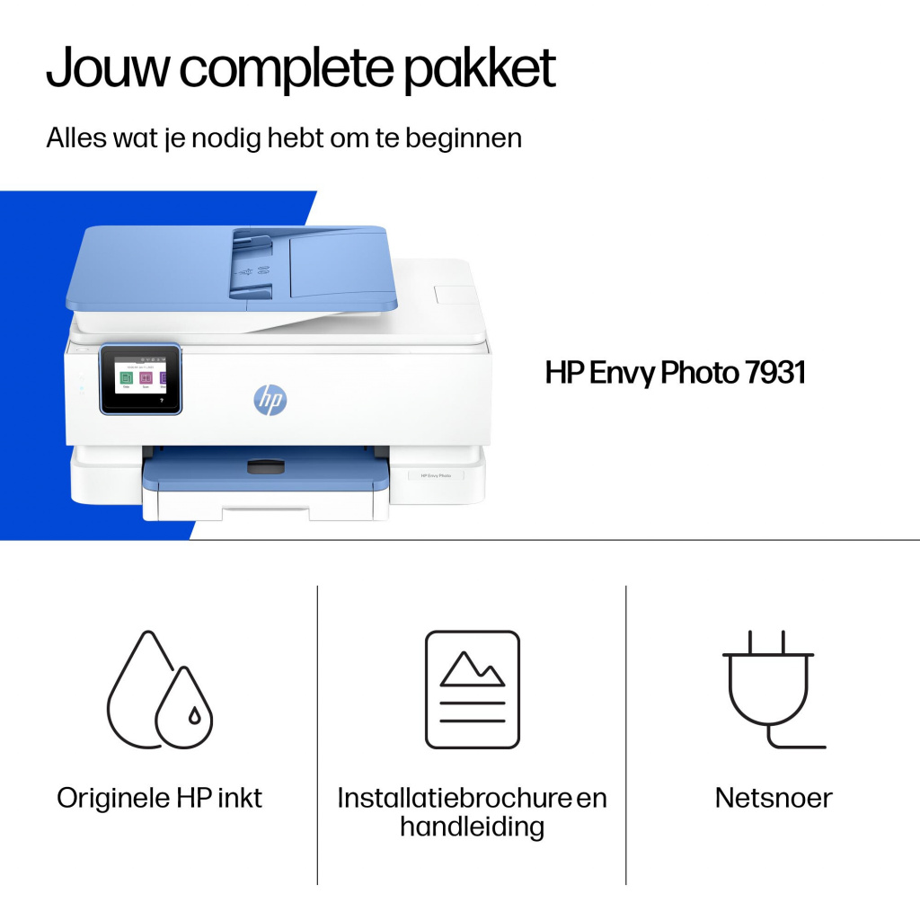 | Inhoud | HP Envy Photo 7931 All-in-One Printer; HP 303 originele zwarte Setup-inktcartridge; HP originele driekleuren Setup-inktcartridge; installatiegids; naslaggids; Netsnoer |