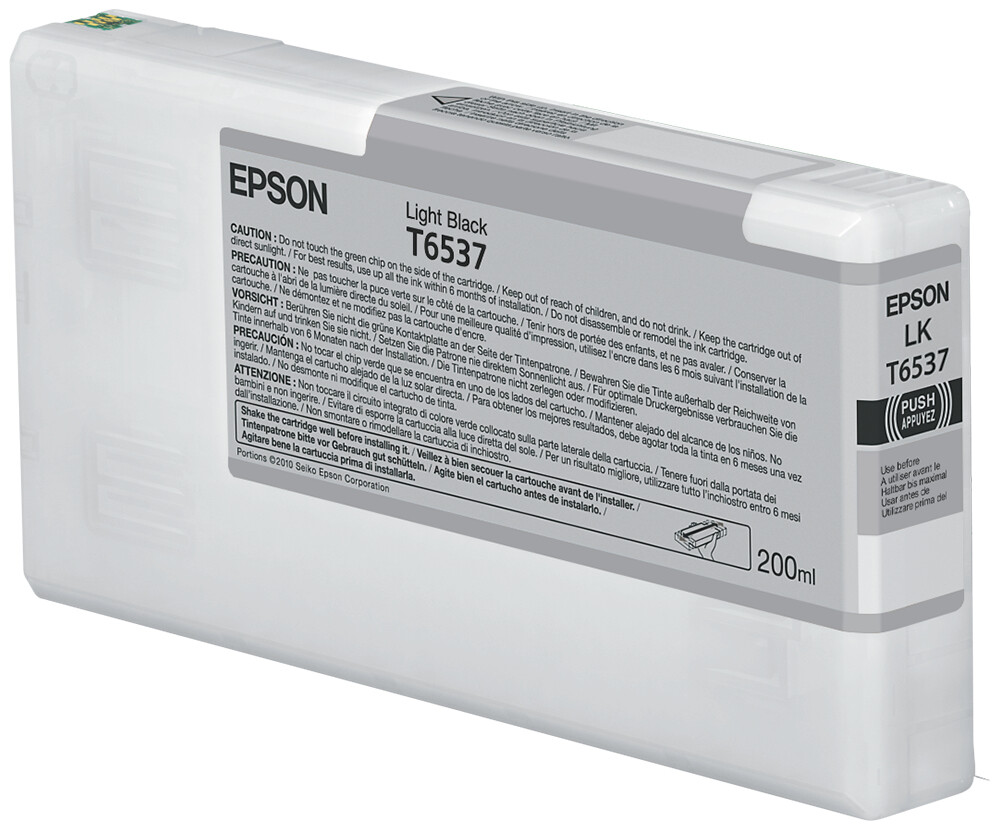 Epson T6537 Light Black Ink Cartridge (200ml). Type kleureninkt: Inkt op pigmentbasis, Volume zwarte inkt: 200 ml, Printkleuren: Licht zwart, Aantal per verpakking: 1 stuk(s)