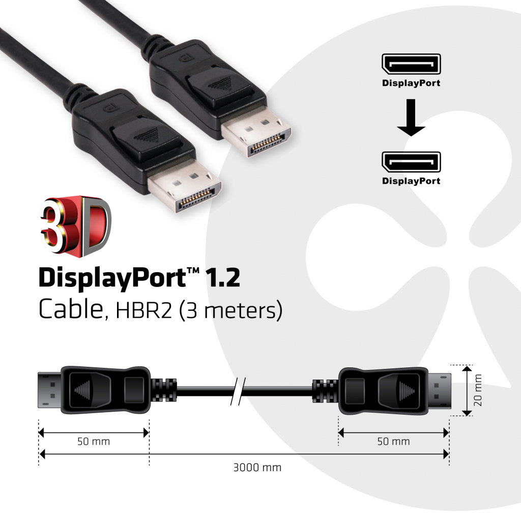 CLUB3D Displayport 1.2 Cable M/M 3Meter 4K60Hz 21.6Gbps. Snoerlengte: 3 m, Aansluiting 1: DisplayPort, Aansluiting 2: DisplayPort. Gewicht: 160 g, Breedte verpakking: 45 mm, Diepte verpakking: 139 mm