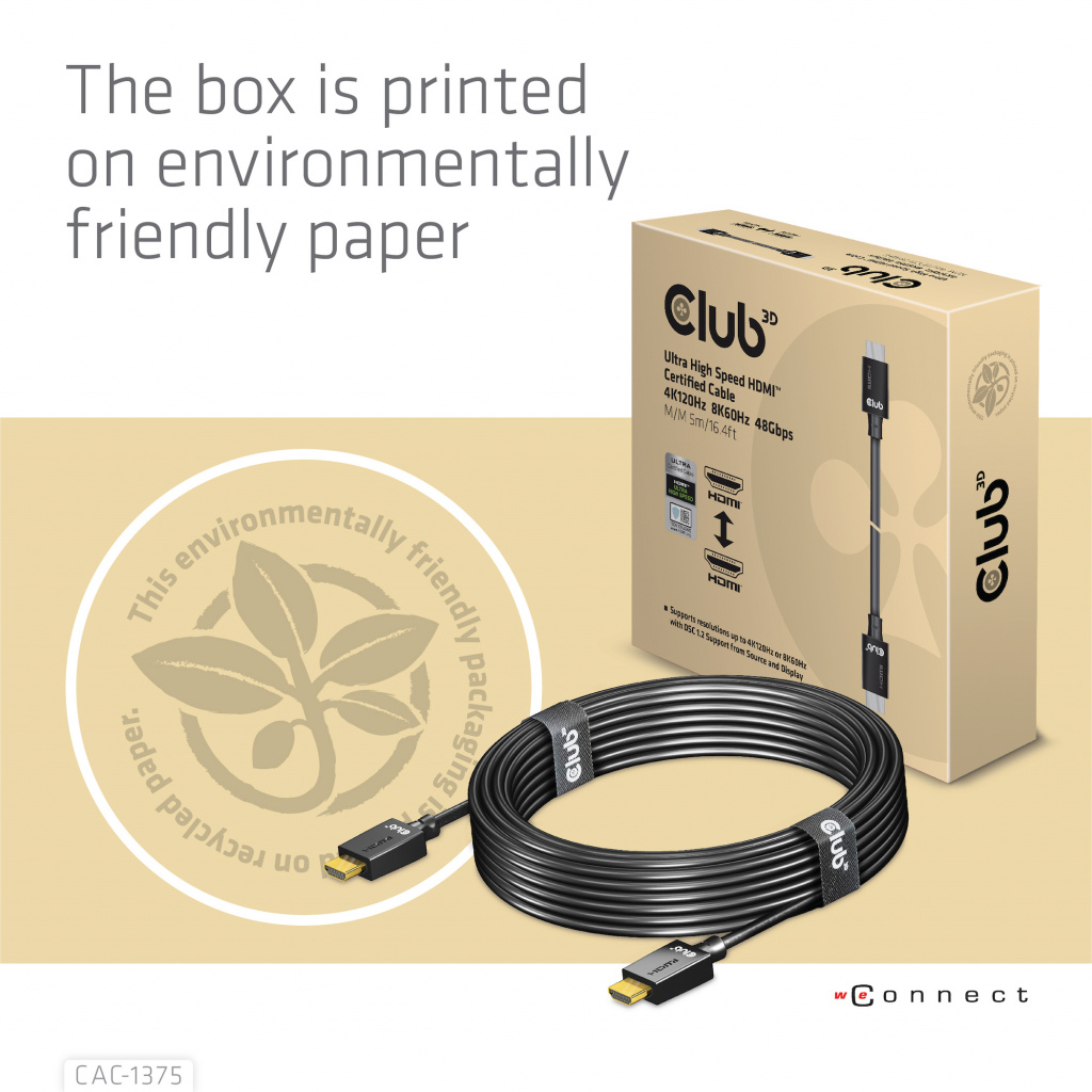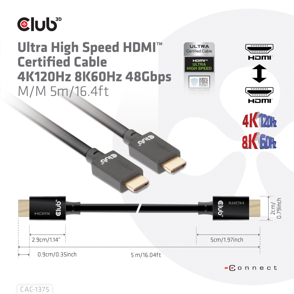 CLUB3D Ultra High Speed HDMI™2.1 gecertificeerde kabel 4K120Hz, 144Hz 48Gbps M/V 5 Meter. Snoerlengte: 5 m, Aansluiting 1: HDMI Type A (Standaard), Aansluiting 1 type: Mannelijk, Aansluiting 2: HDMI Type A (Standaard), Aansluiting 2 type: Mannelijk, Contact geleider materiaal: Goud, HDMI versie: 2.1, Overdrachtssnelheid: 48 Gbit/s, Audio Return Channel (ARC), Kleur van het product: Zwart