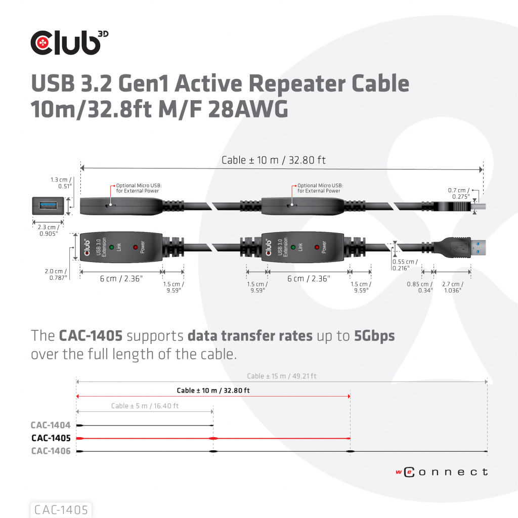 CLUB3D USB 3.2 Gen1 Active Repeater Cable 10m / 32.8ft M/F 28AWG. Snoerlengte: 10 m, Aansluiting 1: USB A, Aansluiting 2: USB A, USB-versie: USB 3.2 Gen 2 (3.1 Gen 2), Kleur van het product: Zwart