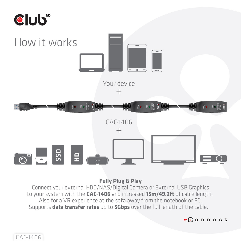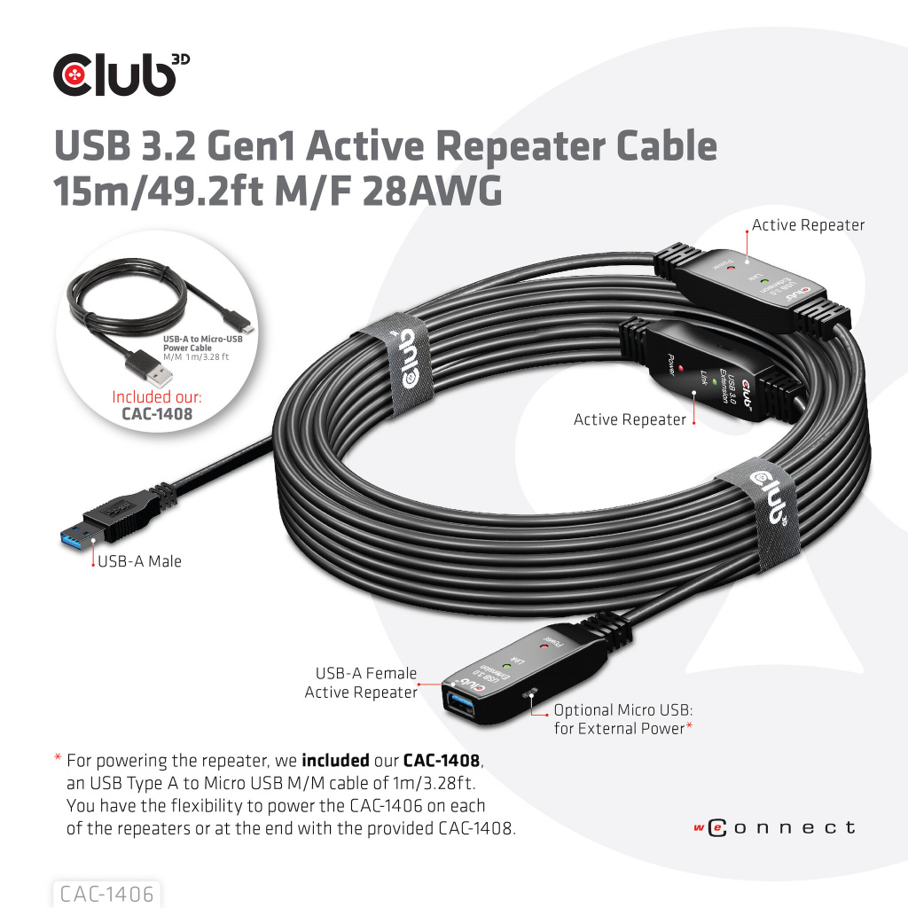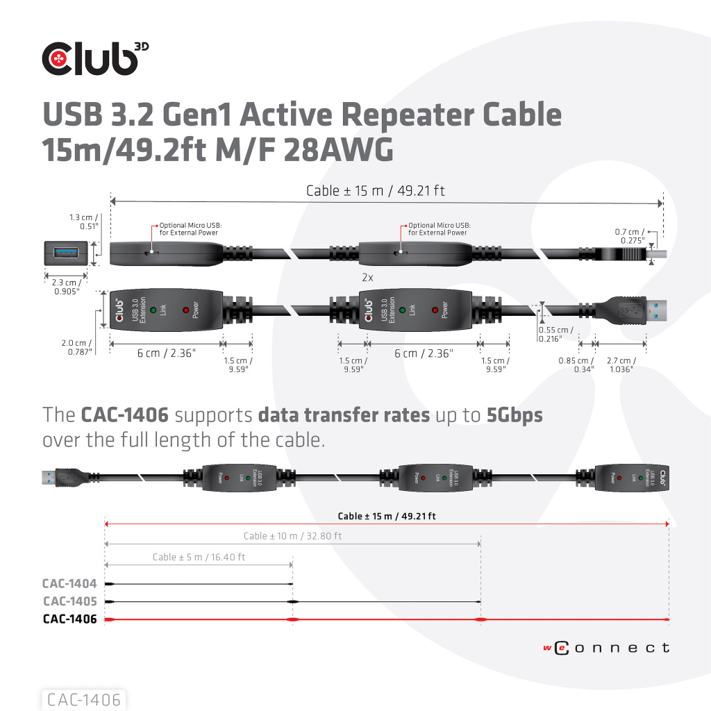 CLUB3D USB 3.2 Gen1 Active Repeater Cable 15m/ 49.2 ft M/F 28AWG