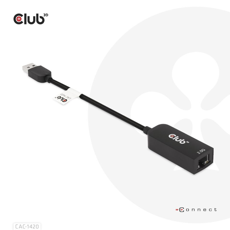 CLUB3D USB 3.2 Gen1 Type A to RJ45 2.5Gbps Adapter. Connectiviteitstechnologie: Bedraad, Hostinterface: USB, Interface: Ethernet. Maximale overdrachtssnelheid van gegevens: 2500 Mbit/s. Kleur van het product: Zwart