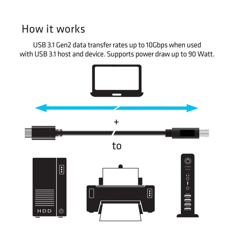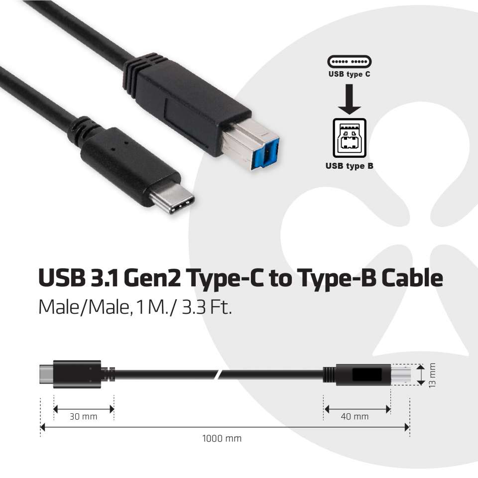 CLUB3D USB 3.1 Gen2 Type-C to Type-B Cable Male/Male, 1 meter. Snoerlengte: 1 m. Aansluiting 1: USB 3.1 Gen2 Type C, Aansluiting 2: USB B, Kleur van het product: Zwart