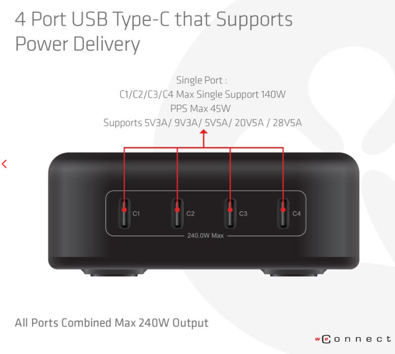 TRAVEL CHARGER 240 WATT GAN TECHNOLOGY-FOUR PORT USB TYPE-C- POWER DELIVERY(PD) 3.1 AND PPS SUPPORT
