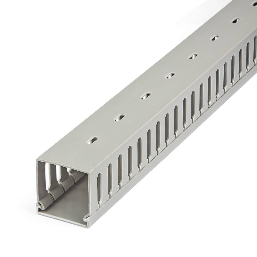 Deze kabelgoot beschermt kabels tegen schade in uw kantoor of serverruimte. De kabelgoot is 50mm hoog x 50mm breed, met 8mm parallelle sleuven (vingergoten), waardoor kabels kunnen worden getrokken om deze makkeljk aan de goot toe te voegen of er uit te verwijderen.