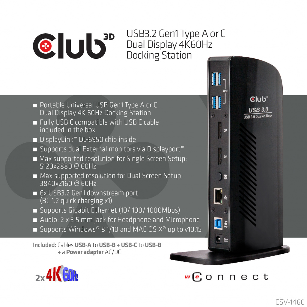 CLUB3D UNIVERSEEL Docking station USB3.2 Type A of C 2x Displayport 4K60Hz DisplayLink® gecertificeerd. Connectiviteitstechnologie: Bedraad, Hostinterface: USB 3.2 Gen 1 (3.1 Gen 1) Type-A, Type aansluitplug: 3,5 mm. Ethernet LAN, data-overdrachtsnelheden: 10,100,1000 Mbit/s. Kleur van het product: Zwart, Resolutie (maximum digitaal): 3840 x 2160 Pixels, Land van herkomst: China. Type stroombron: AC, Spanning: 20 V, Output current: 2,25 A. Ondersteunt Windows: Windows 10, Windows 7, Windows 8