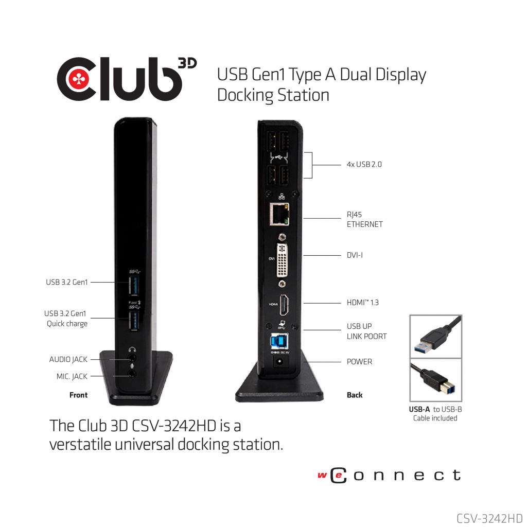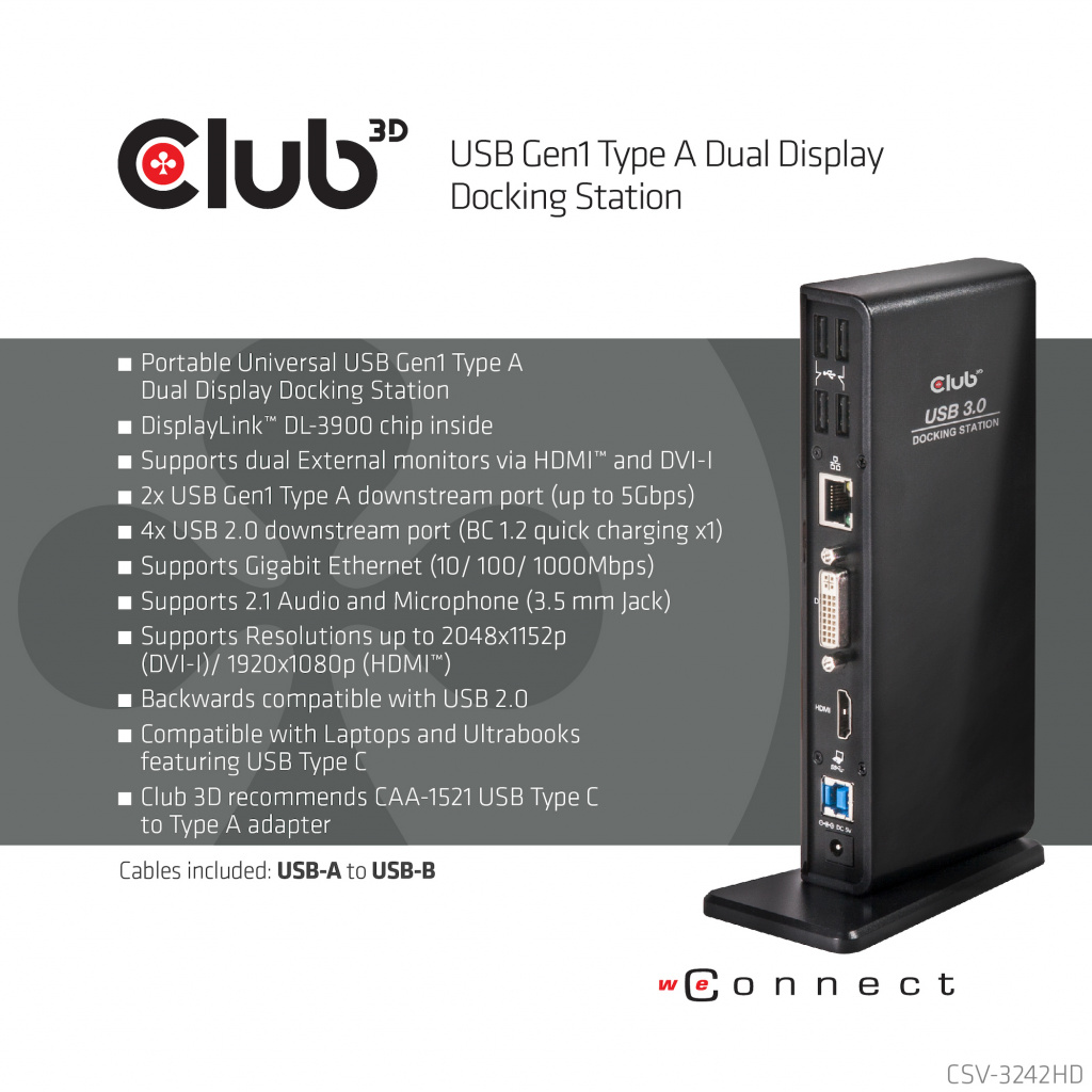 Het Club 3D USB Gen1 Type A Dual Display Docking Station is een veelzijdig universeel dockingstation waarmee u de uitgangen van uw laptop of ultrabook kunt uitbreiden, zodat het kan worden gebruikt als een traditionele desktop-pc.
