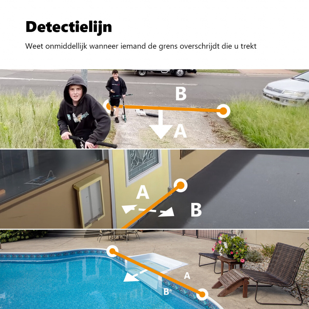 – Detectieregio en detectielijn: Kies in welke zones de camera actief is.