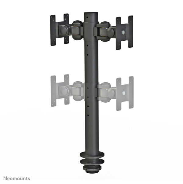 Met deze Neomounts monitorarm, model FPMA-D050DBLACK, bevestigt u 2 flatscreens aan het bureau via een grommet.