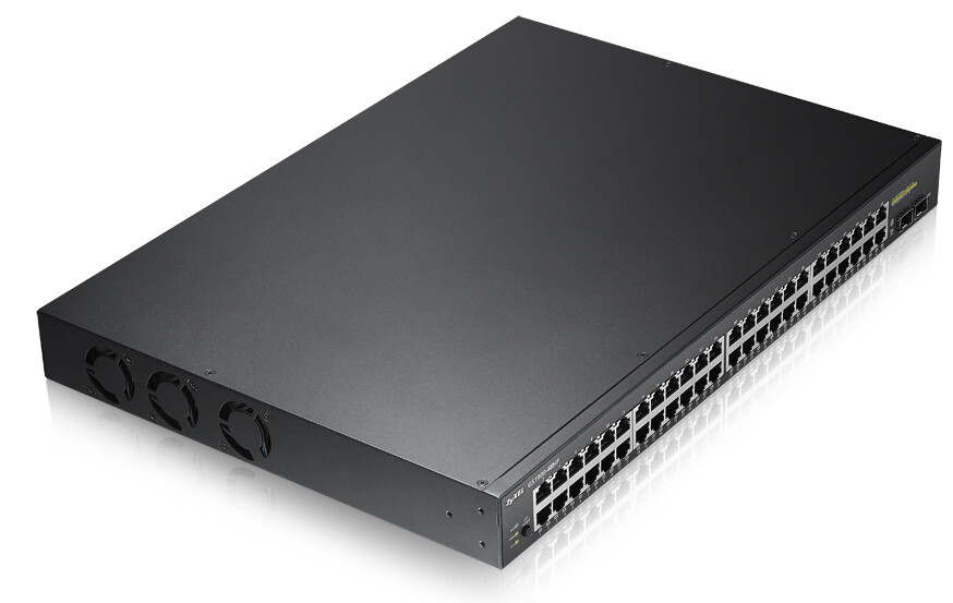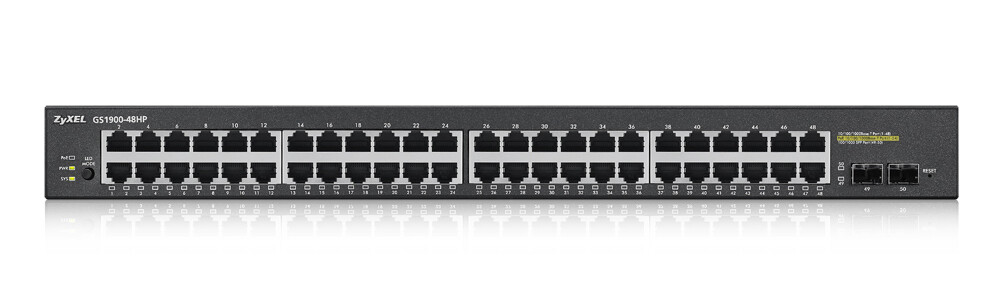 Zyxel GS1900-48HP. Switch type: Managed, Switch-laag: L2. Type basis-switching RJ-45 Ethernet-poorten: Gigabit Ethernet (10/100/1000), Aantal basis-switching RJ-45 Ethernet-poorten: 48. Full duplex. MAC-adrestabel: 8000 entries, Switchingcapaciteit: 100 Gbit/s. Netwerkstandaard: IEEE 802.1p, IEEE 802.1Q, IEEE 802.3, IEEE 802.3ab, IEEE 802.3ad, IEEE 802.3af, IEEE 802.3at, IEEE…. Netstekker: DC-in ingang. Power over Ethernet (PoE). Rack-montage