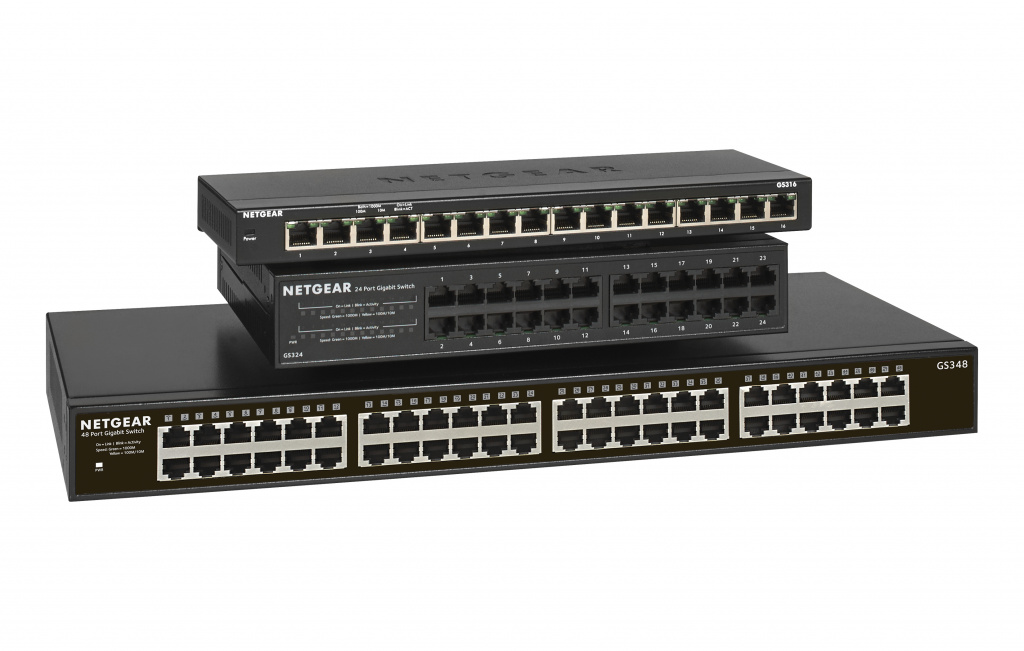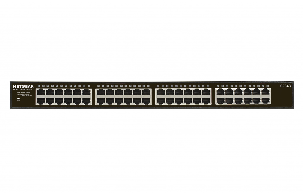 NETGEAR GS348. Switch type: Unmanaged. Type basis-switching RJ-45 Ethernet-poorten: Gigabit Ethernet (10/100/1000), Aantal basis-switching RJ-45 Ethernet-poorten: 48. MAC-adrestabel: 16000 entries, Switchingcapaciteit: 96 Gbit/s. Netwerkstandaard: IEEE 802.1p, IEEE 802.3, IEEE 802.3ab, IEEE 802.3az, IEEE 802.3i, IEEE 802.3u, IEEE 802.3x. Netstekker: DC-in ingang. Rack-montage, Vormfactor: 1U