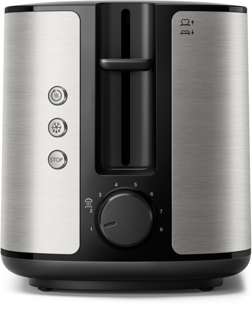 Volledig metalen broodrooster met extra brede sleuf en zelfcentrerende functie voor gelijkmatige bruining ongeacht de dikte van het brood. Kies uit verschillende bruiningsopties en gebruik de geïntegreerde opzethouder. Zo geniet u van knapperig geroosterd brood, warm gebak en afgebakken broodjes.