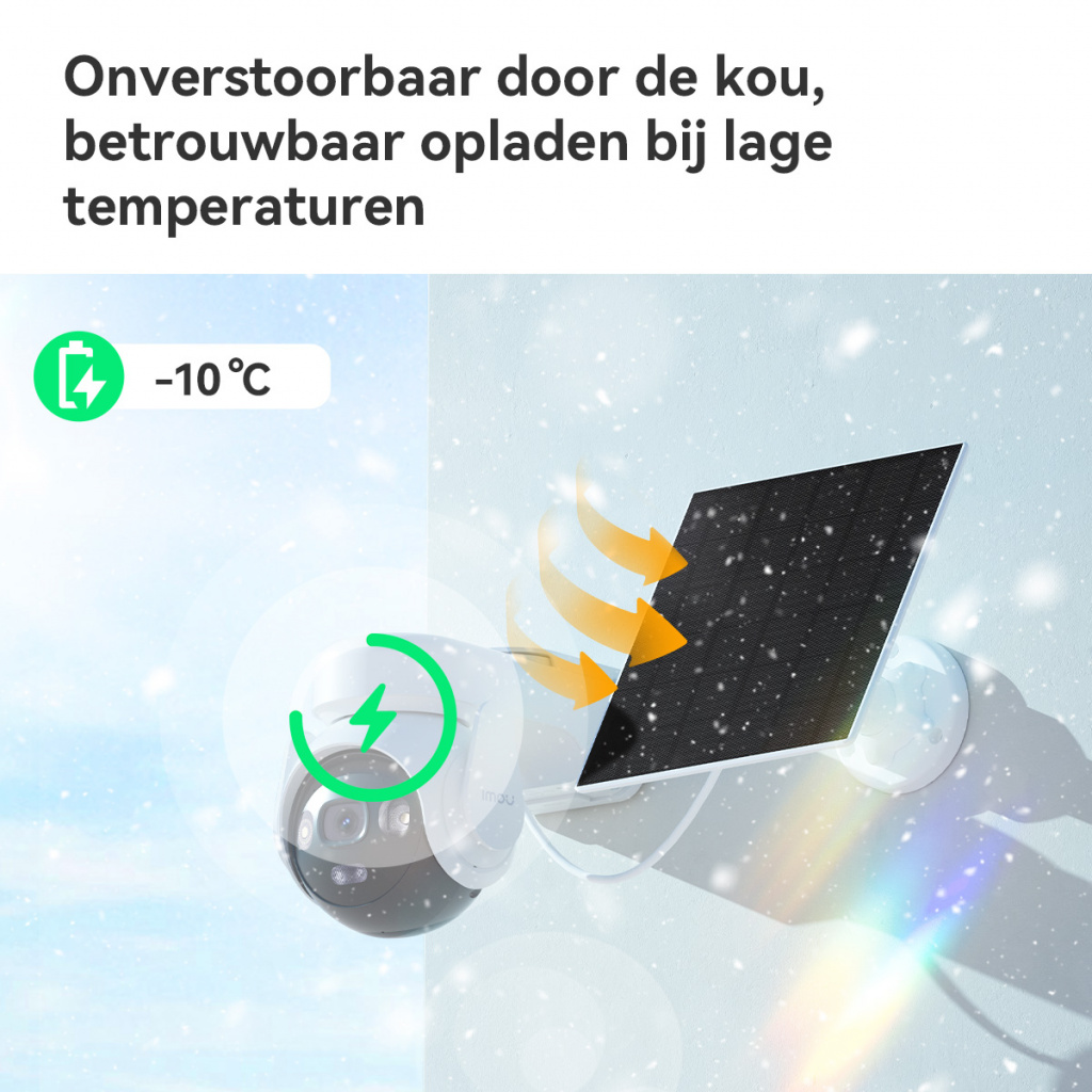 Batterijcamera’s ervaren vaak een probleem met opladen bij lage temperaturen. De nieuwste technologie van Imou biedt hier oplossing op, zelft bij temperaturen van -10 °C wordt de batterij opgeladen.