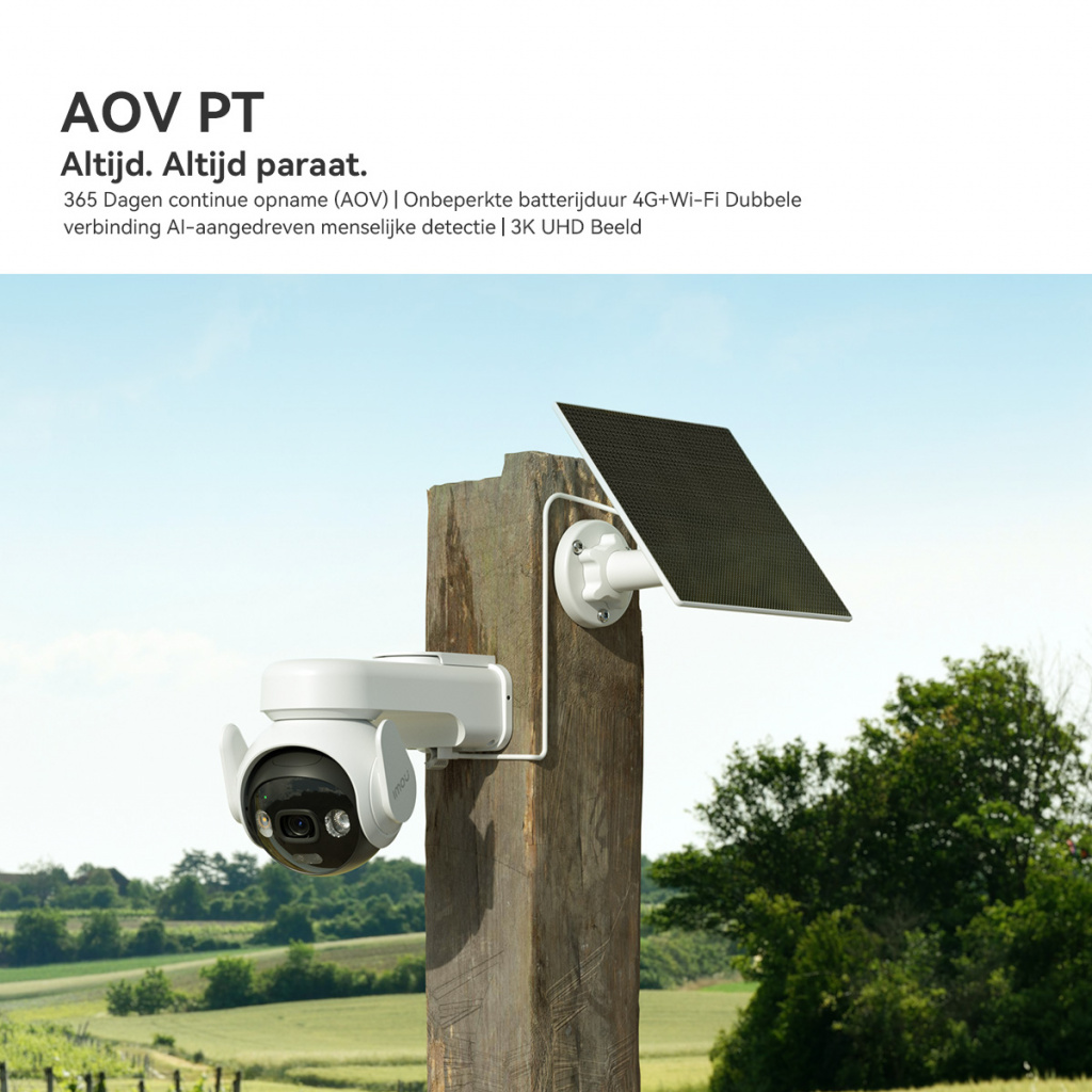 24/7 continue opnames (AOV) | Onbeperkte batterijduur | 4G of wifi connectie | AI persoonsdetectie | 3K UHD beeld