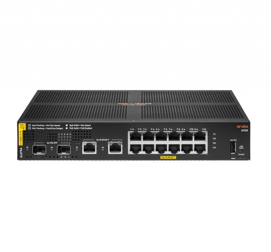 Hewlett Packard Enterprise Aruba 6100 12G Class4 PoE 2G/2SFP+ 139W. Switch type: Managed, Switch-laag: L3. Type basis-switching RJ-45 Ethernet-poorten: Gigabit Ethernet (10/100/1000), Aantal basis-switching RJ-45 Ethernet-poorten: 12, Console port: USB. MAC-adrestabel: 8192 entries, Switchingcapaciteit: 68 Gbit/s. Netwerkstandaard: IEEE 802.1D, IEEE 802.1Q, IEEE 802.1p, IEEE 802.1s, IEEE 802.1w, IEEE 802.3, IEEE 802.3ab, IEEE…. Power over Ethernet (PoE). Rack-montage, Vormfactor: 1U